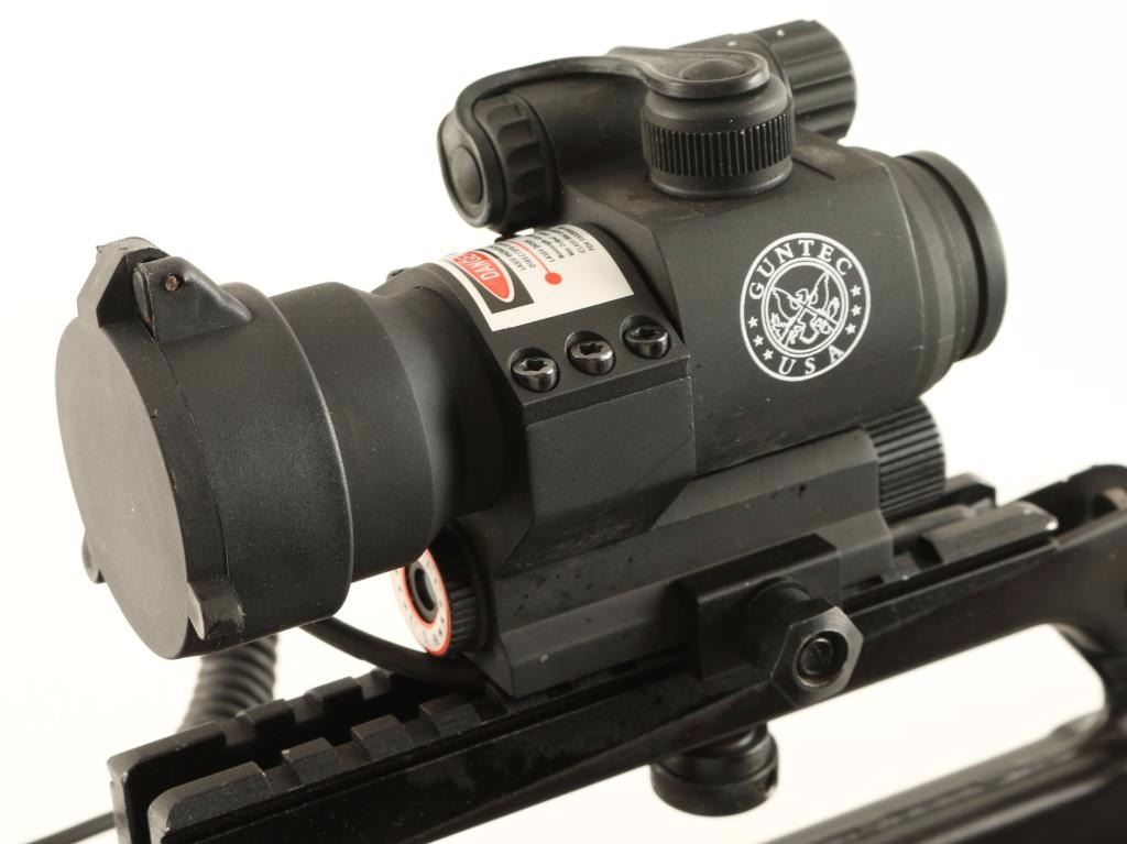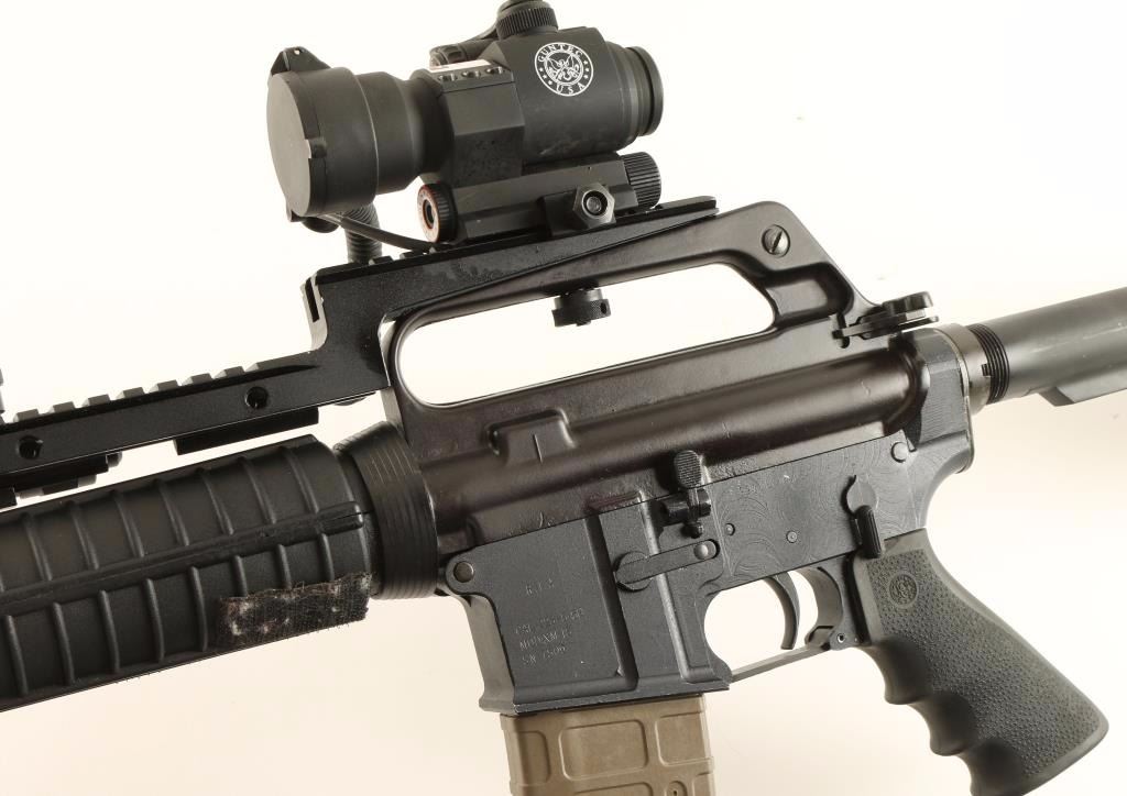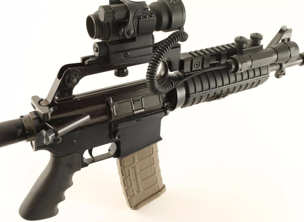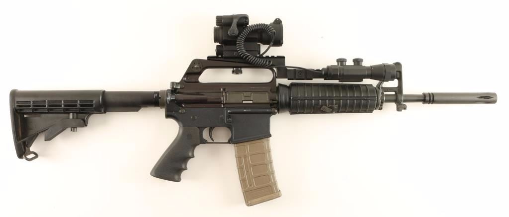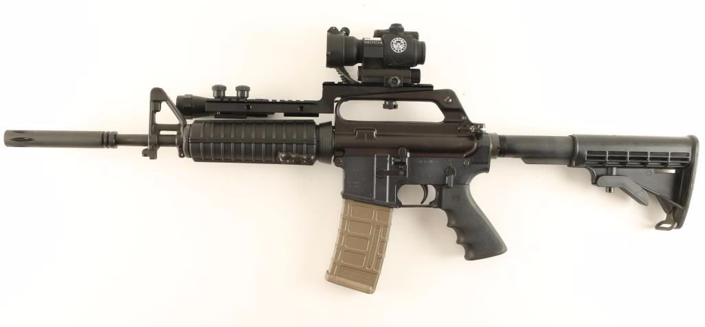 AR platform semi-automatic rifle assembled from various parts and chambered in .223-5.56. Features a black finish, SWG/R.I.A. XM 15 lower receiver, LAR / Martin Marietta upper receiver with integral carrying handle & dual aperture rear sight, bayonet lug, 16.5" barrel with flash hider, A2 style front sight, carbine length handguard, accessory rail with flashlight, red dot & laser, forward assist, manual safety, 30 round Pmag magazine, Hogue rubber coated pistol grip, and a bushmaster six position collapsible stock. Receiver shows milling marks and was like produced pre-ban. Rifle shows light use overall with some edge wear and small blemishes, finish remains 94% intact. Action is strong, bore is bright and stocks are fine. Condition is very good++. ***Modern Firearm***