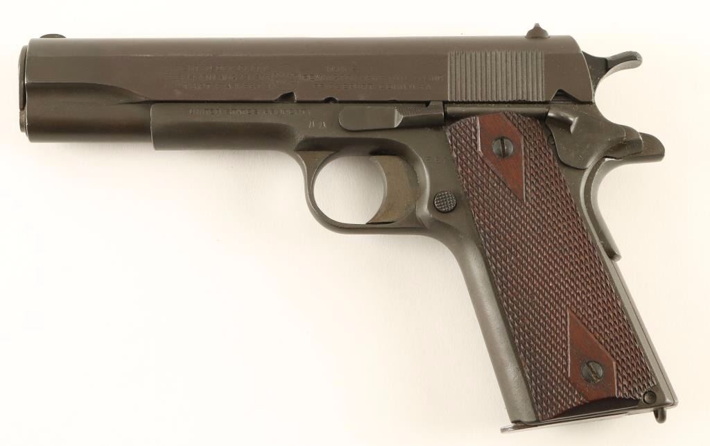 Arsenal refinished single-action semi-automatic U.S. Military pistol with a 5" barrel and one magazine. Made in 1919. Roll-stamps are,"Model of 1911 U.S. Army", "United states Property", "E.E.C.", "AA" on the frame. Stamped "V" on barrel lug and "P" or "HP" on top above chamber. Assembler number "3" on right trigger guard. Parkerized refinish has faded to a green/brown hue from the preservative. The hammer is the domed wide spur type but it is black and has an "S" stamped on the left side. Magazine is not a two-toned finish. The double diamond grips are almost excellent with one ding on the bottom of the right grip. Bore is mirror bright with sharp rifling. Comes in a cardboard box with Kraft paper dated 1963, a cleaning brush and cleaning rod. Condition is excellent. *Modern Firearm*