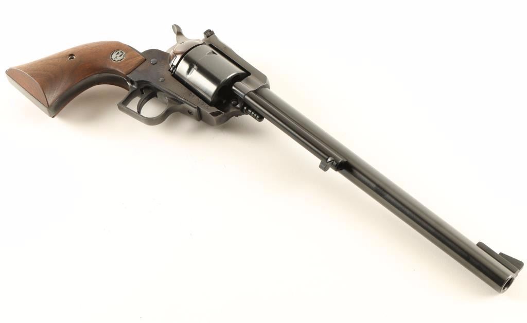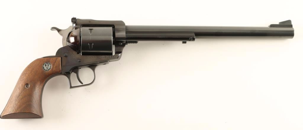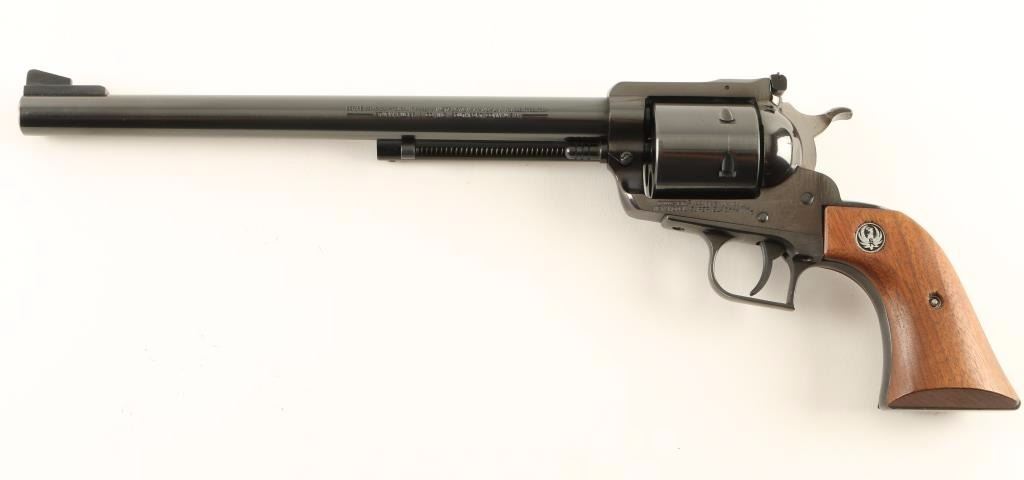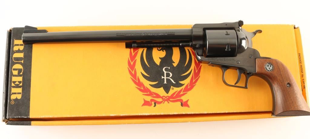SN: 84-31960 Inproved large frame single action revolver chambered in .44 Magnum, circa 1981. Features a blued finish, 10.5" barrel, ramped front sight, adjustable rear window sight, non-fluted six shot cylinder, serrated wide hammer spur, transfer bar safety, partially serrated trigger, square back trigger guard, and two piece smooth walnut Ruger medallion grips. Includes factory box with documents. Revolvers's frame is turning plum, cylinder shows a moderate drag line, and overall shows very little wear from use or handling. Action is smooth, bore is pristine and wood grips are fine. Condition is excellent in box. ***Modern Firearm***