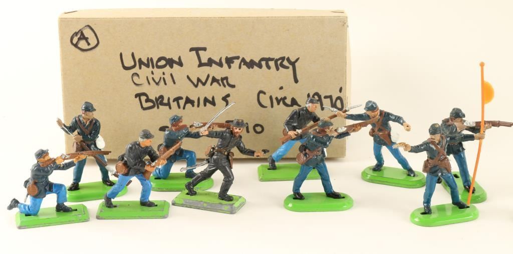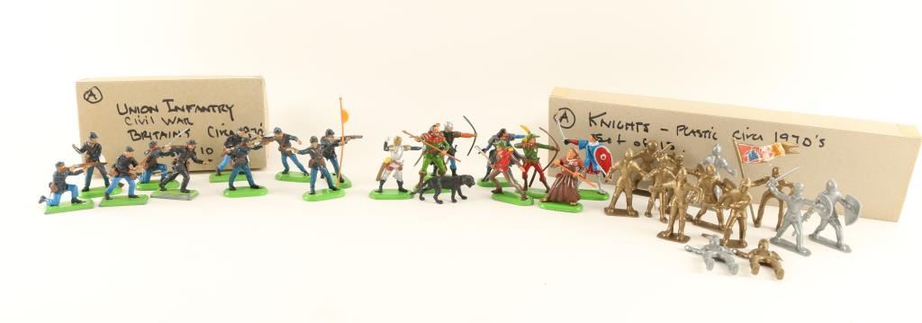 Circa 1970's with metal base, plastic construction figurines. Including; Robin Hood-set of 8 figures, Union Infantry Civil War-set of 10, Knights-set of 13 that are all plastic construction. Good condition. Nice collection.