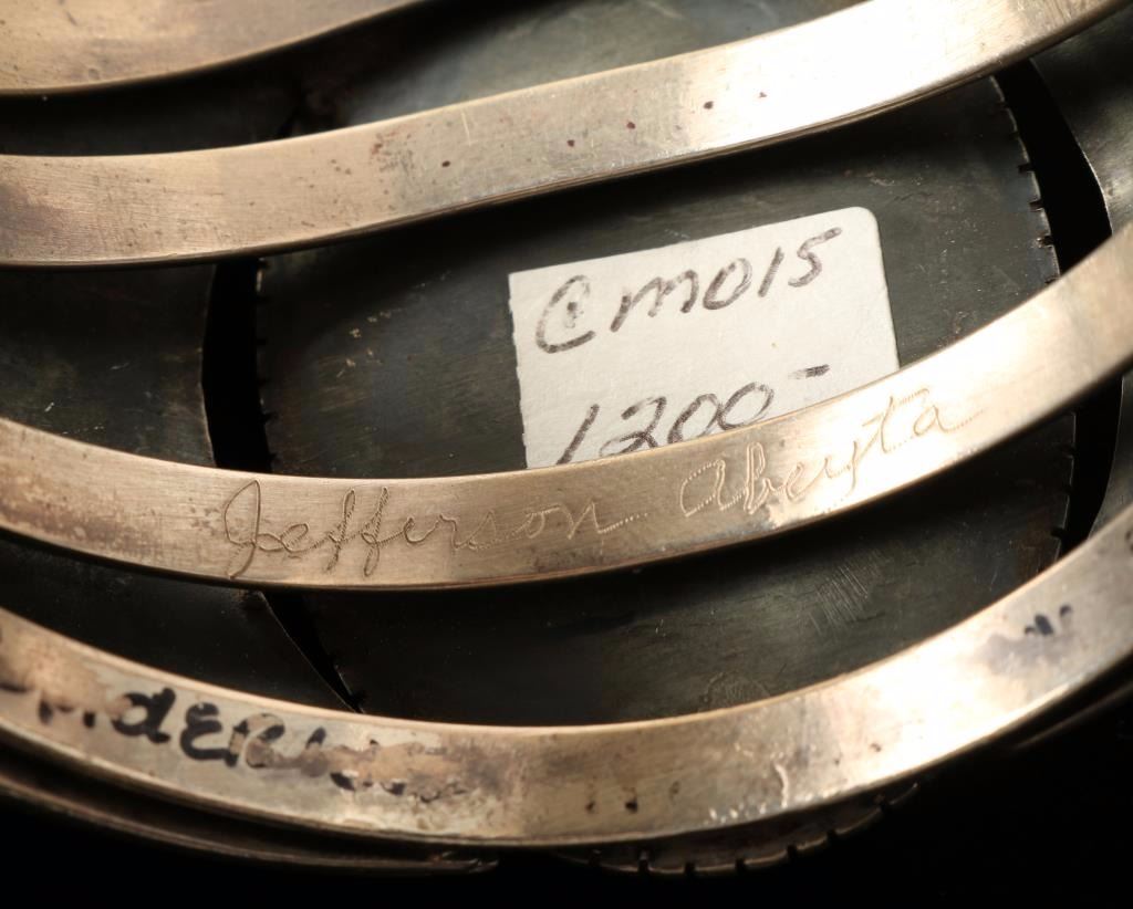 Signed 'Jefferson Abeyta'. Single large spiderweb turquoise stone set in heavy sterling silver. Retail $1200.
