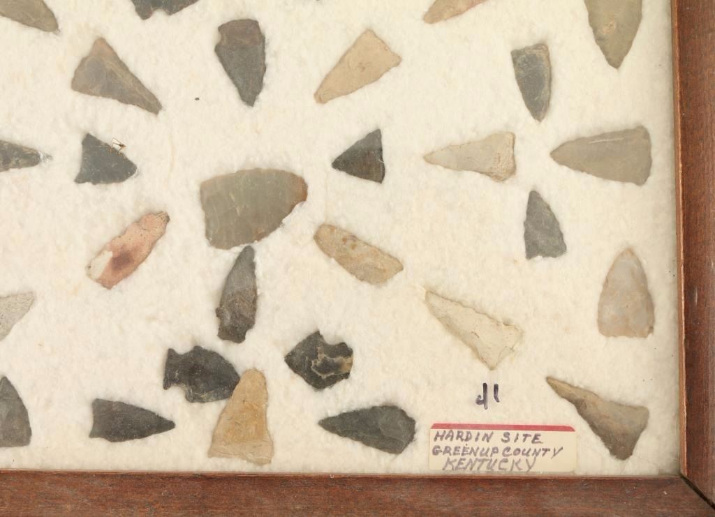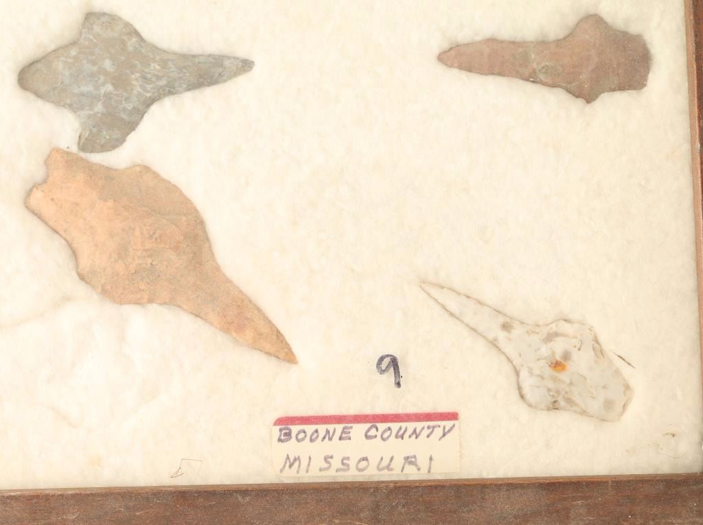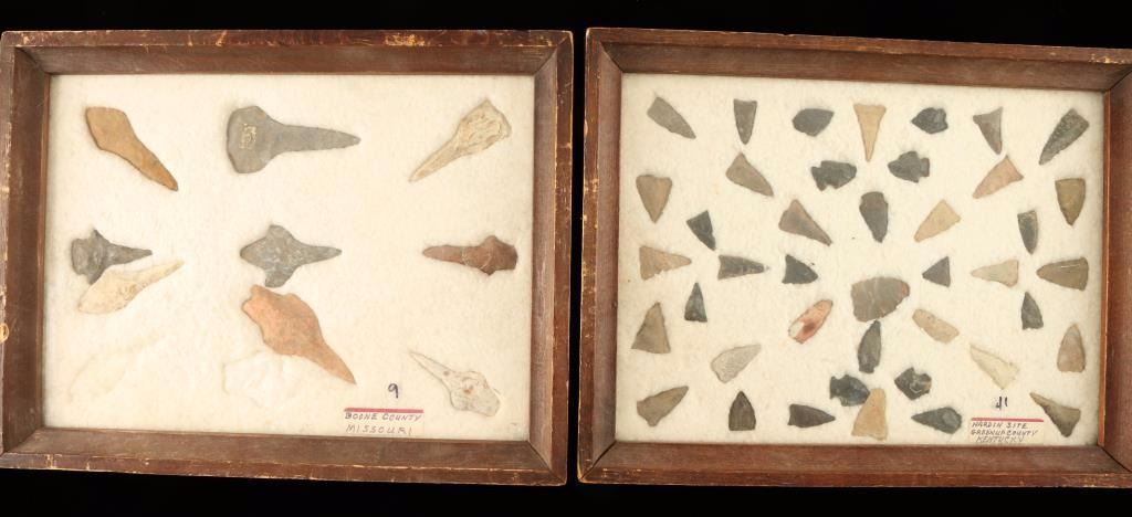 1 has nine drill points from Boone County, Missouri and the other has 42 smaller points from Hardin Site in Greenup County Kentucky. In wood frames, Measure 13 1/4"x10 1/4". Frames show some dings and scratches.