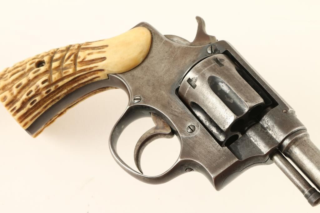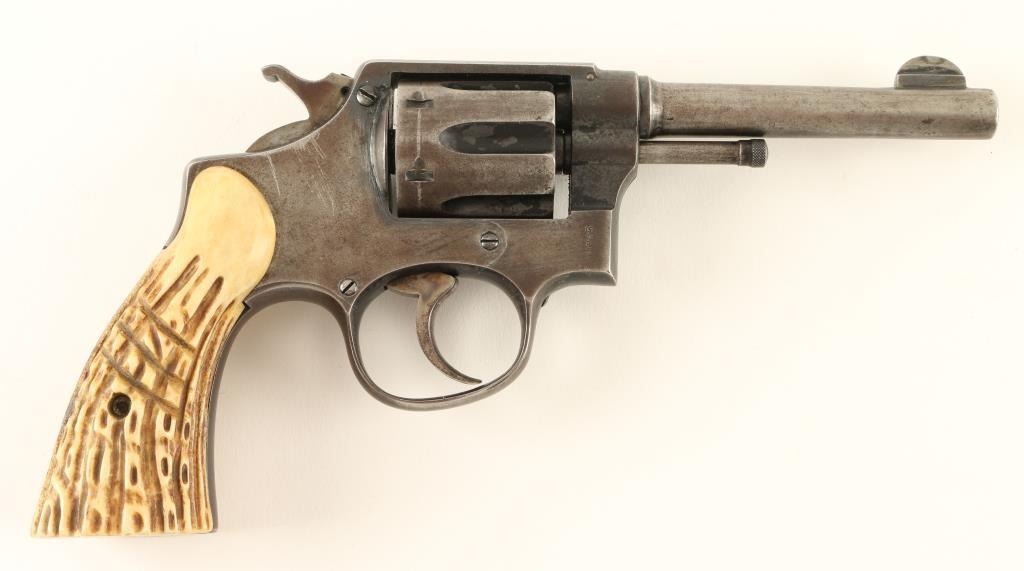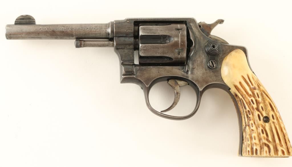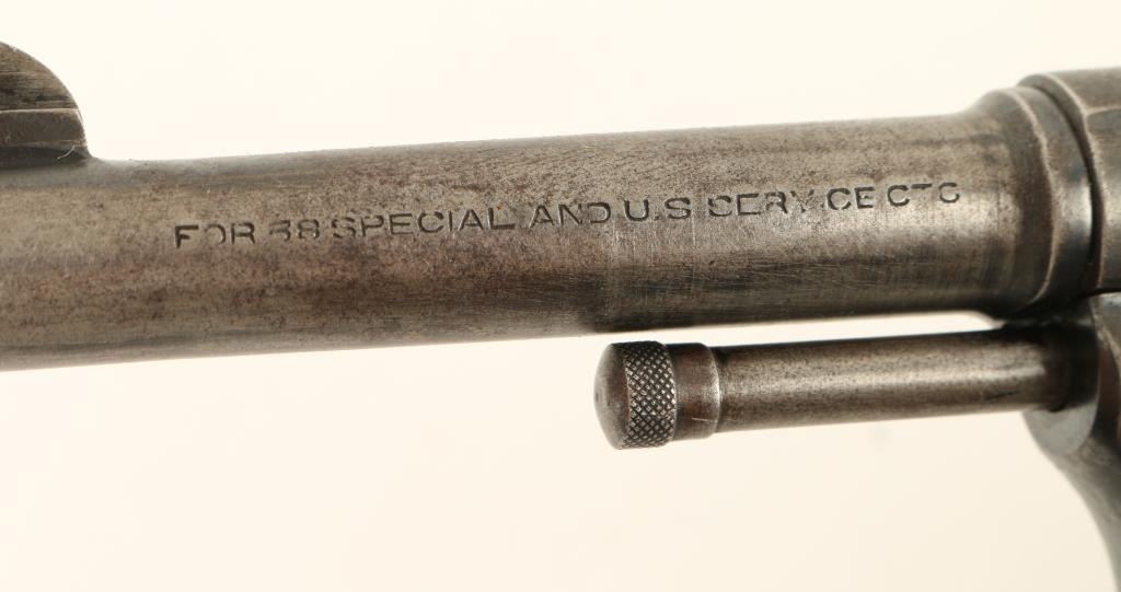 Spanish made copy of a Smith & Wesson double action revolver chambered in .38 Special. Features a blued finish, 4.5" pinned barrel, blade front sight, notched rear sight, fluted six shot cylinder, smooth case hardened trigger, case hardened hammer with checkered spur, and custom two piece stag grips. Revolver exhibits approximately 20% of it's original finish showing heavy wear. Action is sound, bore is good and grips are fine with 3 notches in the right grip. Condition is good as vintage. ***Modern Firearm*** ***C&R Firearm***