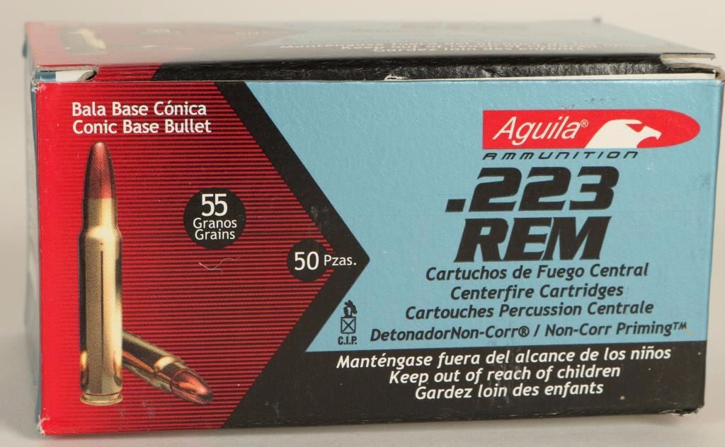 Consisting of twenty 50 round boxes of Aguila 55 grain full metal jacket ammunition.