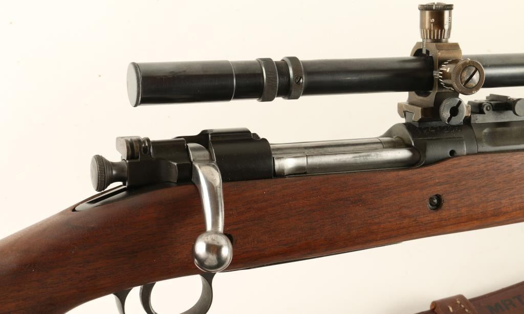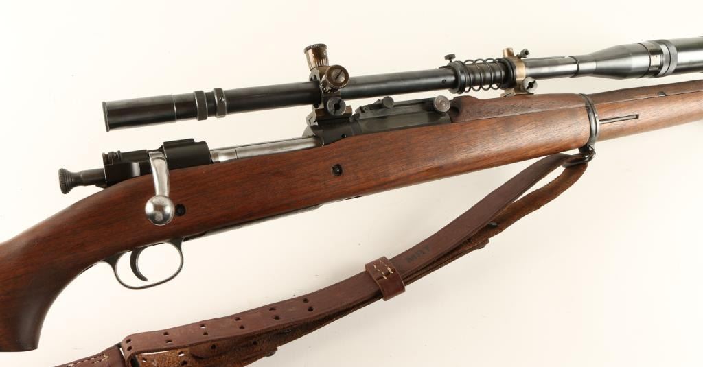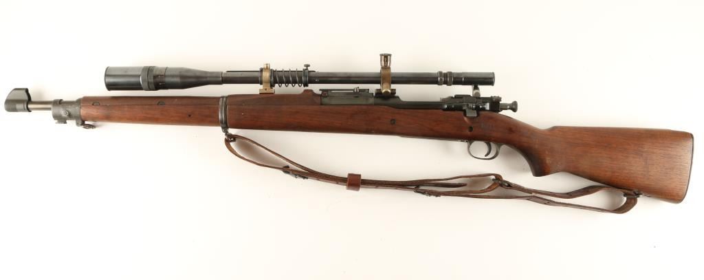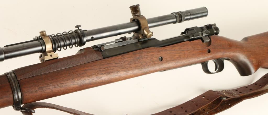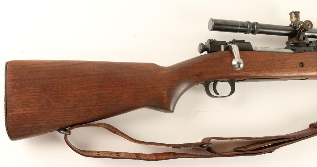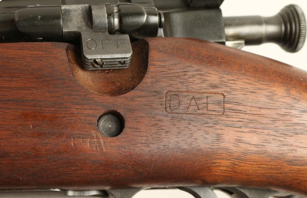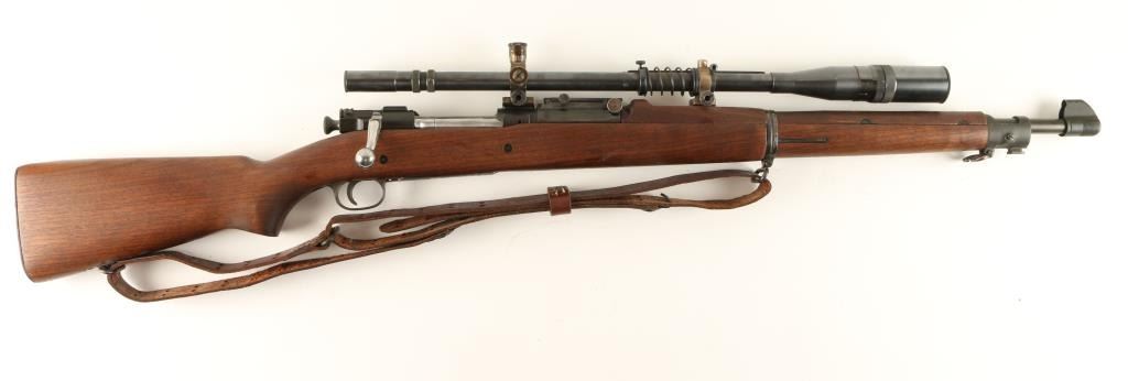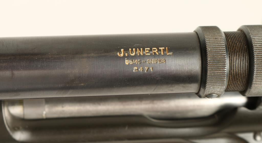 Rebuilt U.S. Military bolt action sniper rifle chambered in .30-06 Springfield, circa 1922. Features a blued finish, star-gauged 24" barrel marked "SA(flaming bomb)5-22", blade front sight, adjustable rear sight graduated to 2,700 yards, J. Unertl "USMC-Sniper" marked 8X scope with adjustable rings, sunshade & lens caps, integral five round box magazine with cut-off switch, polished bolt marked "WN3S", safety switch on bolt, serrated trigger, two barrel bands with bayonet lug, later brown leather sling marked "MRT", parkerized checkered metal trapdoor buttplate, full smooth walnut forend and pistol grip shoulder with circled "P" & "D.A.L." cartouche. Scope is in very good condition. Includes metal muzzle cover. Rifle retains approximately 90% of it's arsenal refinish with most wear on front sight band. Action is smooth, bore is pristine, and wood stocks are extra fine. Condition is excellent. ***C&R Firearm*** ***Modern Firearm***