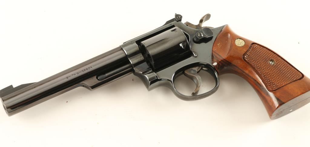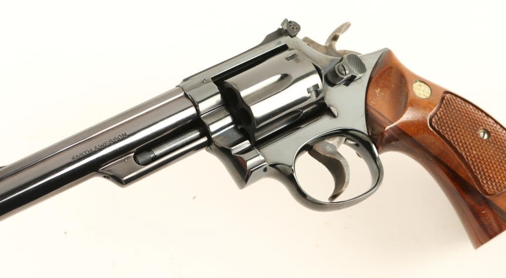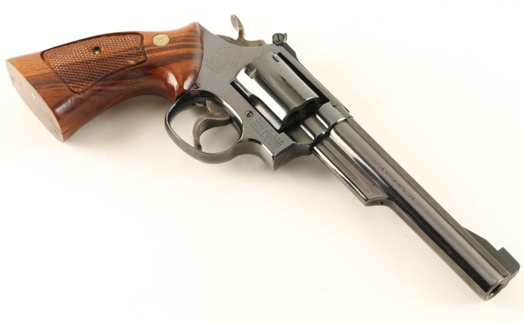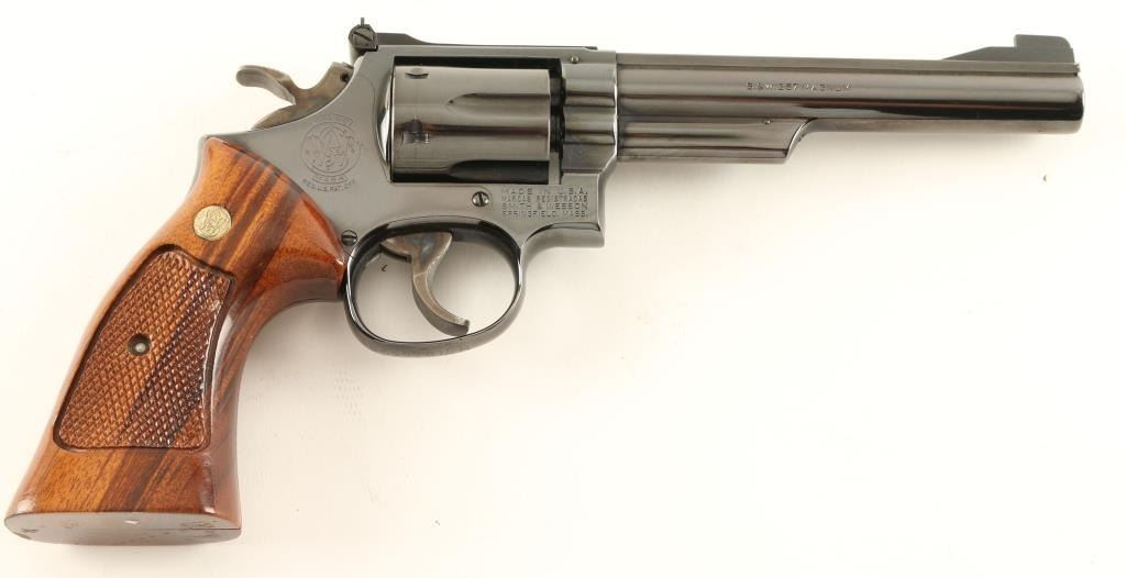 'Combat Magnum' K frame double action revolver chambered in .357 Magnum. Features a blued finish, pinned 6" ribbed barrel, ramped patridge front sight, adjustable micrometer click rear sight, shrouded ejector rod, fluted six shot cylinder, .500 target trigger, .500 target hammer, and S&W medallion checkered target grips. Revolver shows only light muzzle, few blemishes on cylinder and a moderate drag line. The bottom of the trigger guard has what appears to be a drivers license number carved into it. Action is very smooth, bore is pristine and grips are fine. Condition is near excellent. ***Modern Firearm***
