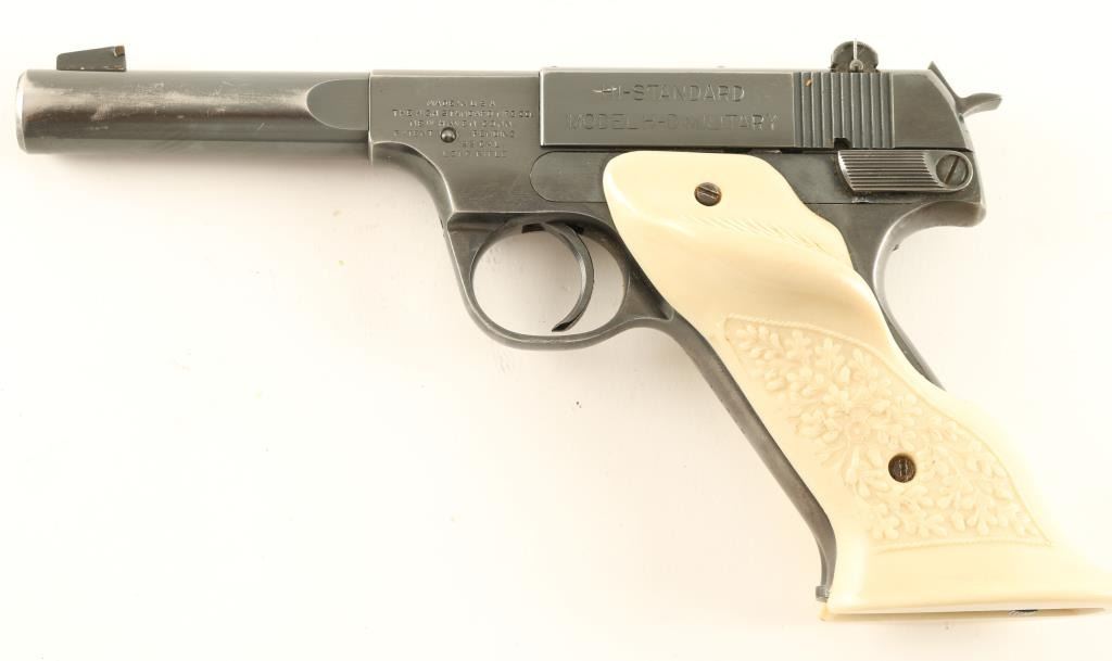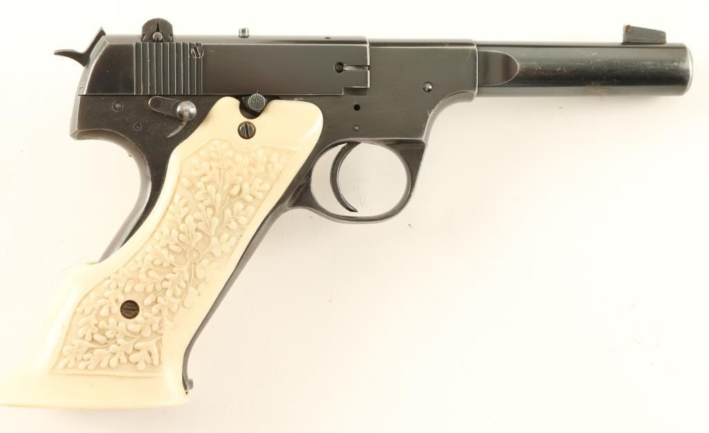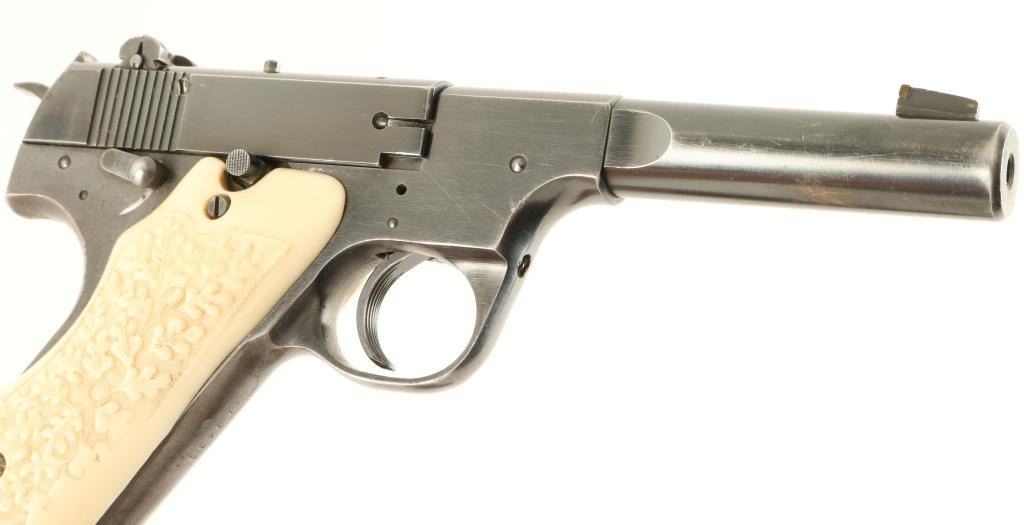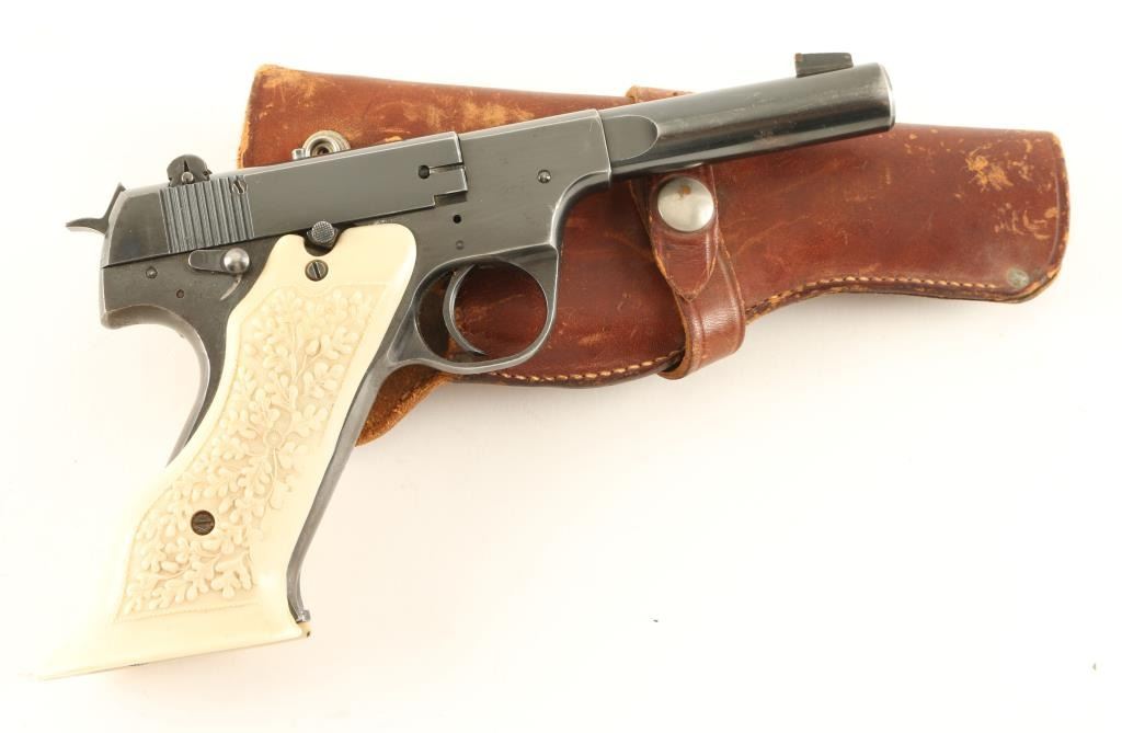 Single action semi-automatic target pistol chambered in .22 Long Rifle, circa 1945 - 1950. Features a blued finish, 4.5" heavy barrel, patridge front sight with brass bead, adjustable rear sight, serrated trigger and slide, thumb safety, checkered hammer spur, slide hold-open lever, and custom floral white plastic target grips. Includes a Redhead brown leather holster. Pistol retains approximately 70% finish intact, showing heavy holster wear and wear on grip frame. Pistol also shows light damage to the outside of the muzzle. Action is smooth, bore is excellent and grips are fine. Condition is good to very good. ***Modern Firearm*** ***C&R Firearm***
