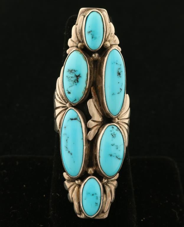 Six oval shaped turquoise cabs set in an elongated design, unmarked, set in sterling silver.