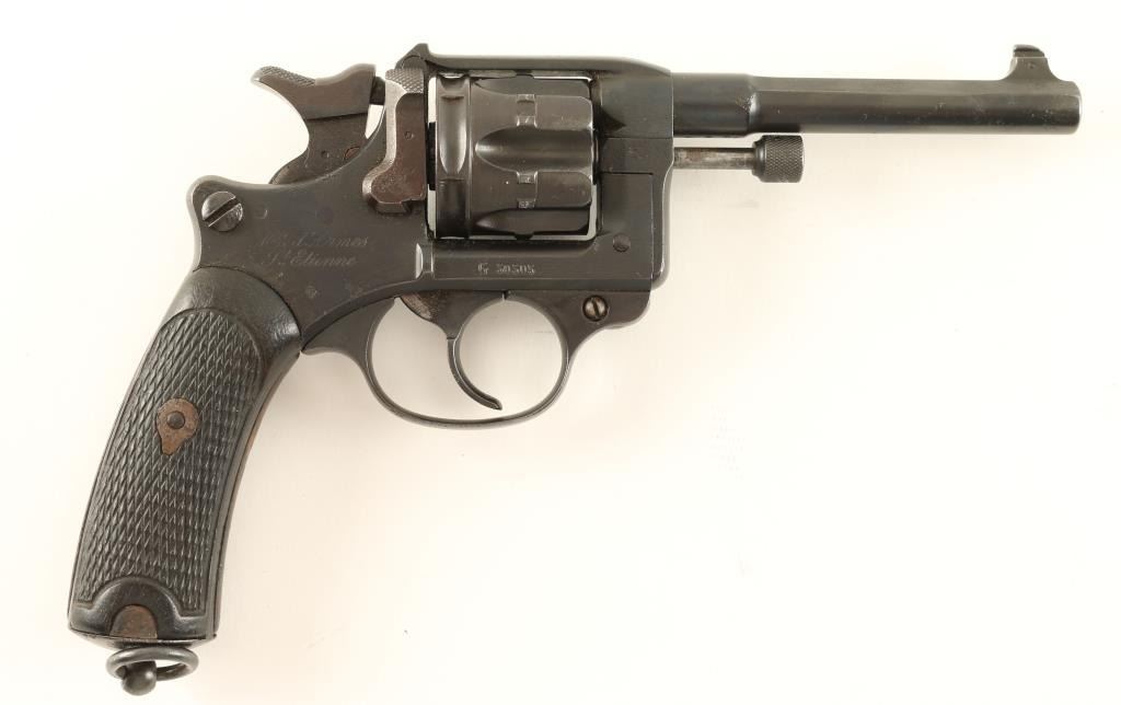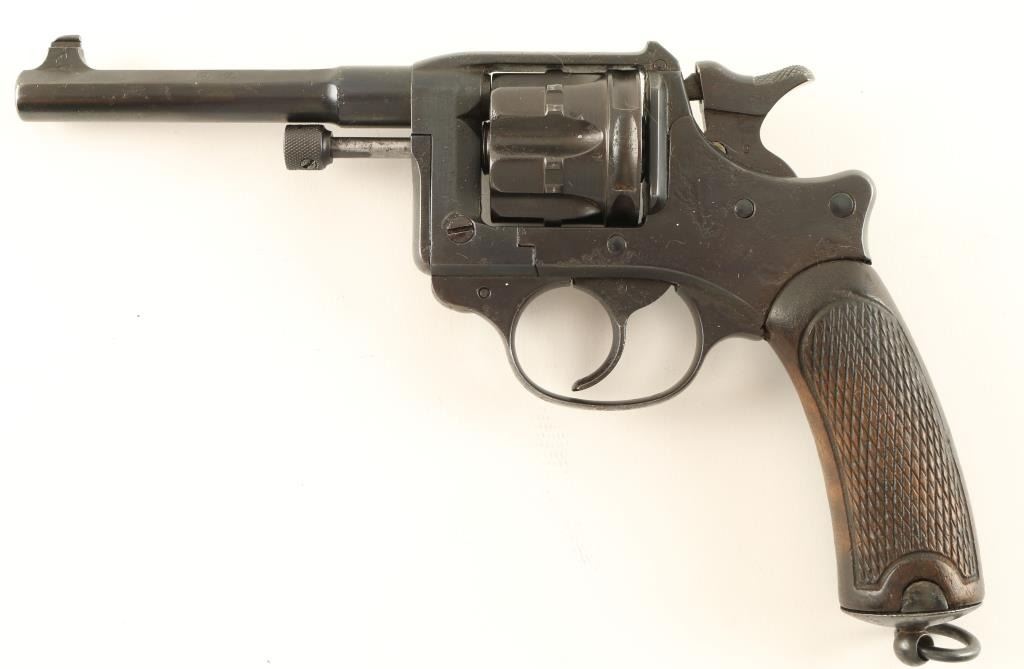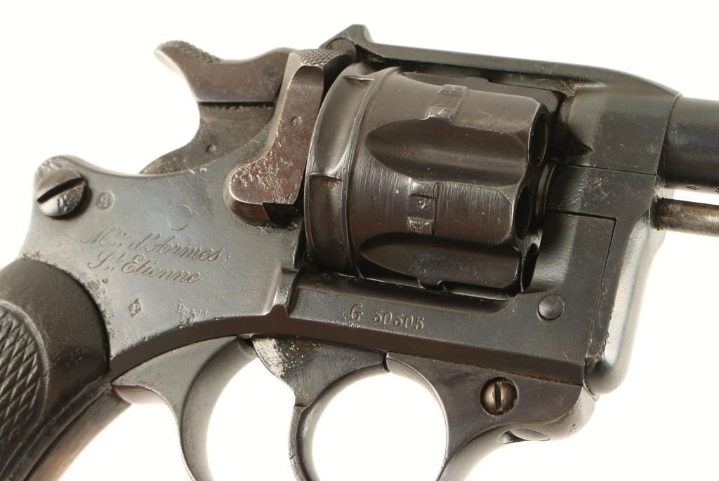 'Lebel' French military double action revolver chambered in 8x27mm, produced at the St. Etienne armory circa 1899. Features a blued refinish, 4.6" barrel, blade front sight, notched rear sight, fluted six shot swing out cylinder, smooth trigger, checkered hammer spur lanyard ring and and two piece checkered dark wood grips. Revolver exhibits approximately 97% of it's blued refinish with visible pitting under the finish. All standard military marking are present. Action is sound, bore is good with some pitting and grips are very good. Condition is good. ***Modern Firearm*** ***C&R Firearm***