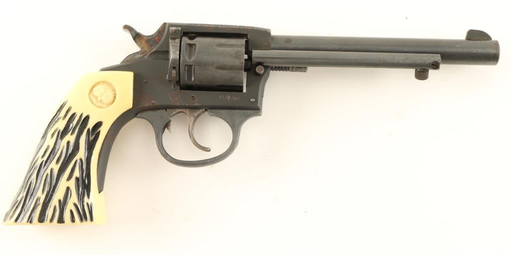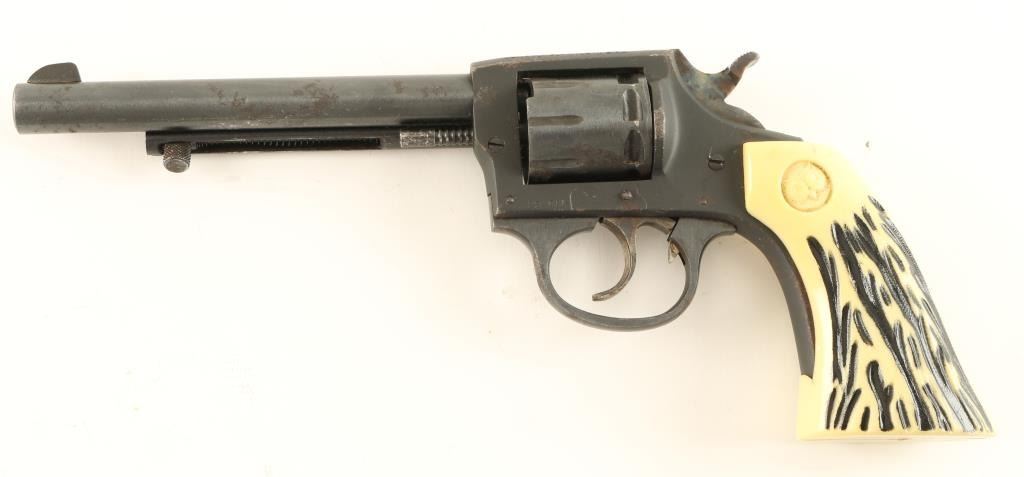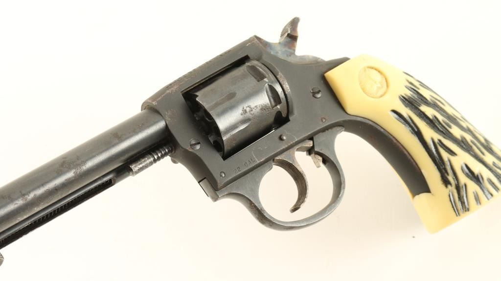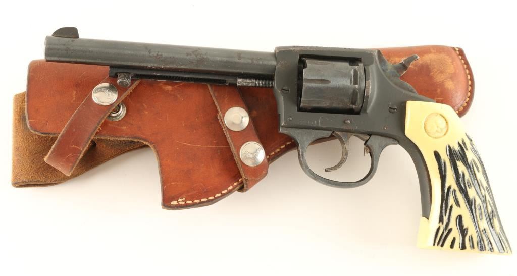 'Sidewinder' Double action rimfire revolver chambered in .22 Long Rifle. Features a blued finish, 6" barrel, ejector rod, blade front sight, notched rear sight, fluted eight shot cylinder, case hardened & serrated trigger & hammer spur, and two piece faux stag Iver Johnson owl grips. Includes a Hunter brown leather holster. Revolver retains approximately 80% of it's blued finish with scattered surface rust. Action does not rotate the cylinder consistently, bore is bright and grips are fine. Condition is near good. ***Modern Firearm*** ***C&R Firearm***