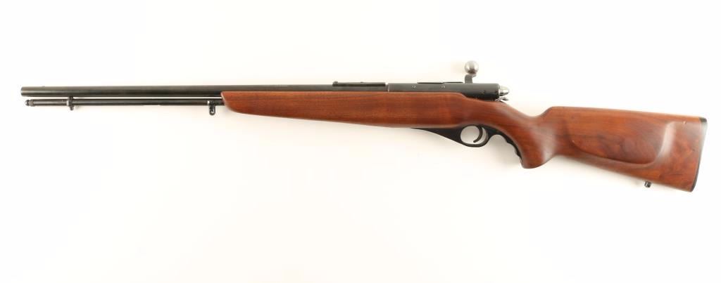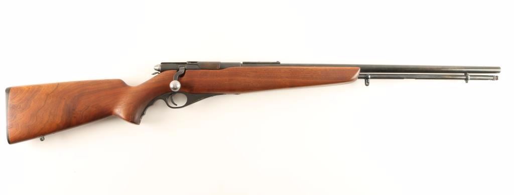 Tube-fed bolt action sporting rifle chambered for .22 Short, Long or Long Rifle, circa 1940's - 1950's. Features a blued finish, 23.25" barrel, full tube magazine, removed sights, mounted scope rail, serrated trigger, bent bolt handle, dust cover, manual safety, swivel studs, black plastic trigger guard with finger grooves, and one piece smooth walnut pistol grip shoulder stock with cheek rest. Rifle retains approximately 75% of it's blued finish with areas of wear turning to a brown patina. The magazine tube is not locked into position and can slide forward. Action is smooth, bore is very good and wood stock is fine. Condition is good to very good. ***Modern Firearm*** ***C&R Firearm***