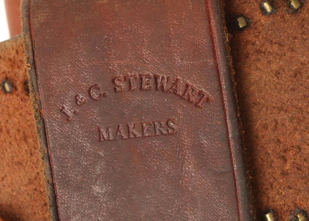 Made by J.C. Stewart, smooth brown leather accented with brass spots and buckles with a stamped Slim Jim holster which is marked. 36" to center hole.