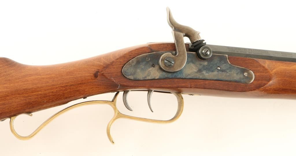 Modern production Spanish made .50 caliber percussion rifle in classic Hawken style. Features a blued 28" octagonal barrel, blade front sight, adjustable rear sight, double set trigger, Delrin ram rod, brass furniture, case hardened lock, finger rest trigger guard, patch box, serrated hammer spur, and full-length select hardwood straight grip shoulder stock. Rifle retains approximately 93% original blued finish with some blemishes on barrel. Action is crisp, bore is clear and wood stock is good showing a crack on the opposite side of the lock & another at the wrist. Condition is very good. ***Antique Firearm***