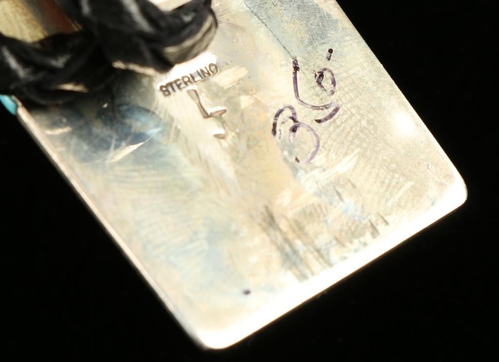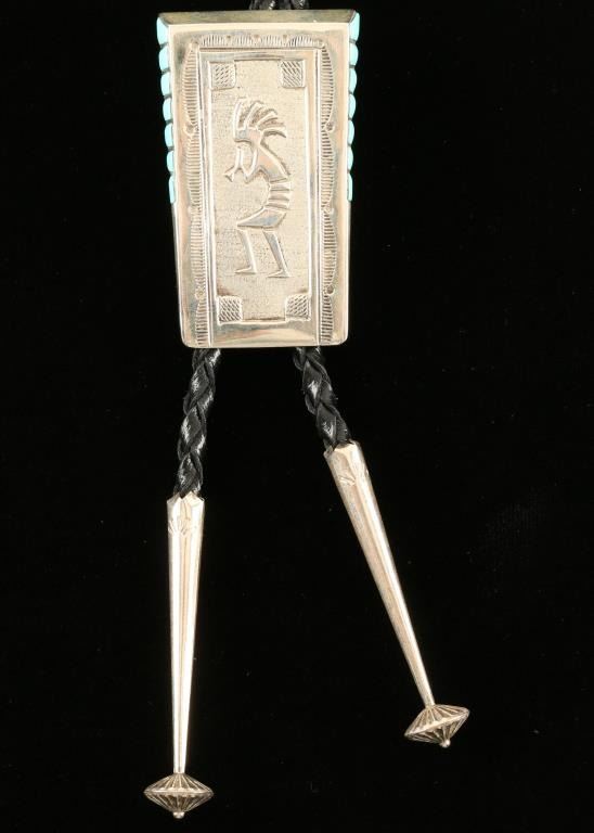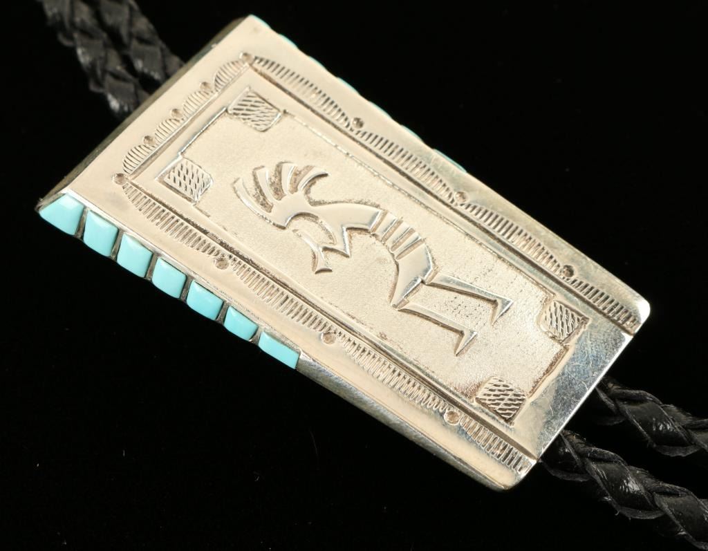Kokopelli design with inlaid square cut turquoise. Stamped 'IJ" set in sterling silver with sterling silver tips. Retail $150