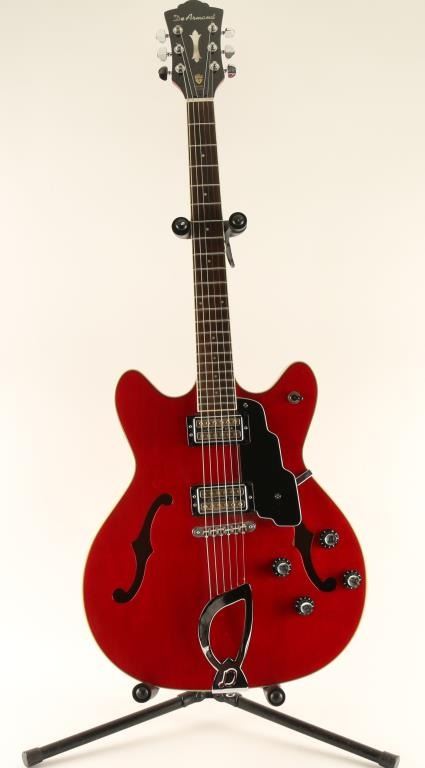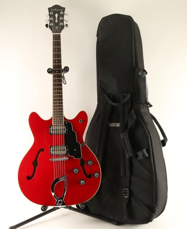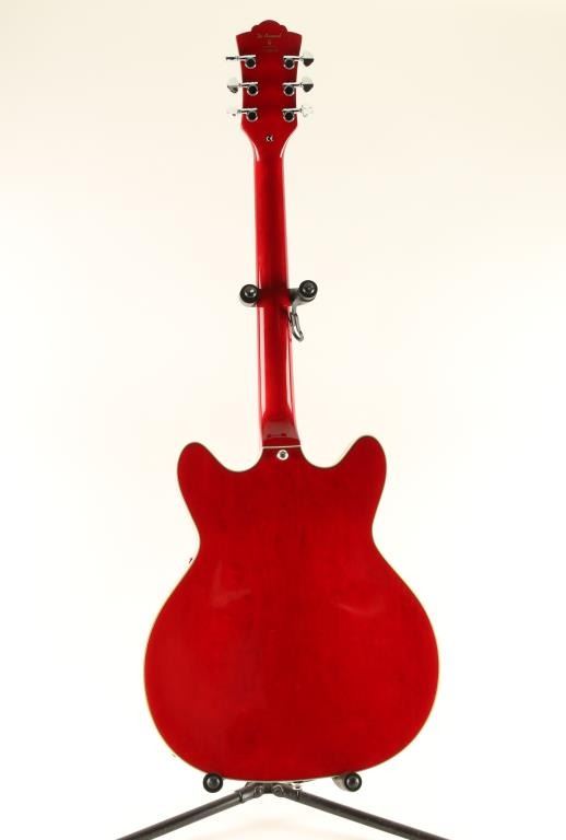 Cherry finish with rosewood fret board. Two pick up, two volume, two tone controls, and three way pick up selector switch. Used very little. Comes in soft case. Very good condition.