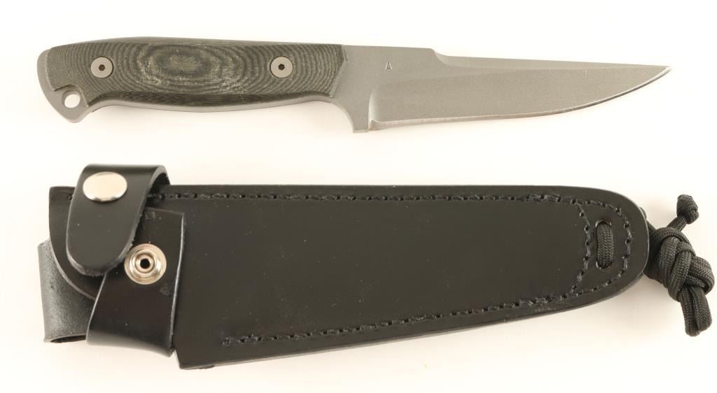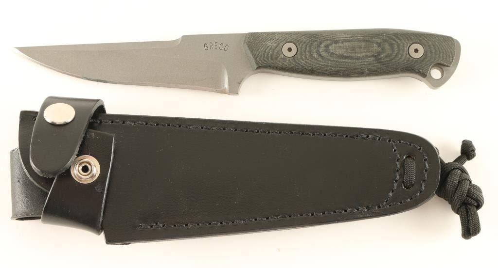 It's made of 1/8" stock, but feels like an extension of your hand, making it very "fast." It's stamped GRECO on one side of the tang and the mysterious "A" on the reverse side. It's full-tang with butt drilled out for a lanyard. Grip is ergonomic and can be used in traditional and reverse grip. Excellent lines in the design and blade is hollow ground, razor sharp right to the point. Well-made sheath of thick black leather. The blade is covered in an anti-glare that is effective, but unknown to me. Measures 9 1/2" overall with a 4 1/2" blade.