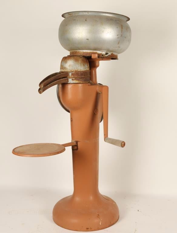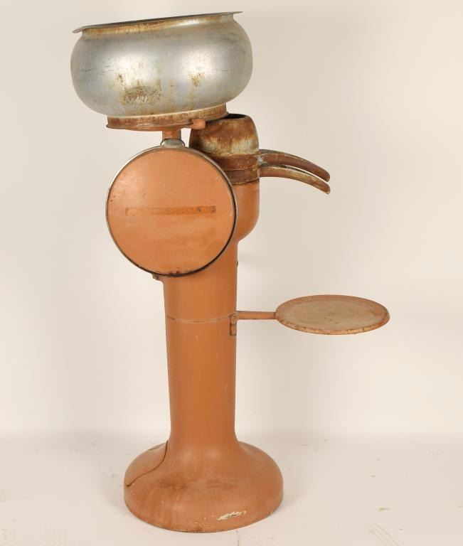 Hand crank operation with orange base and galvanized bowl. Great outdoor decorator.