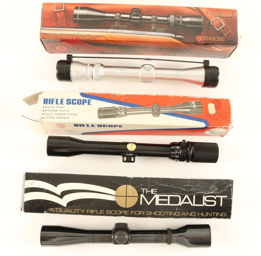 1 The Medalist Model M4W 4 Power scope with Dual X reticle, 1 Armsport Model W394OX 3-9X40%, 1 Simmons Prohunter Model 7710 silver finish 3-9x32. All in original boxes.