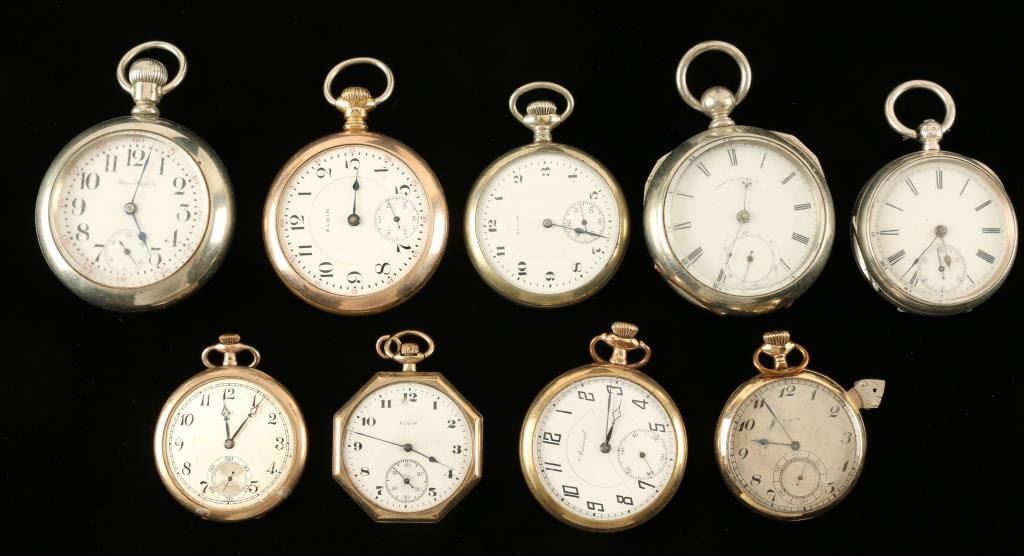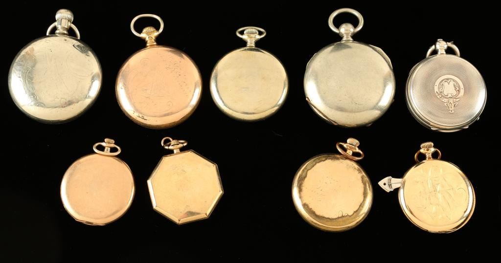 4 Elgin, 1 Illinois Watch Co., 1 Admiral, 1 unknown and 1 American Watch Co. not in working condition, for parts. Rolled gold and silver plate.
