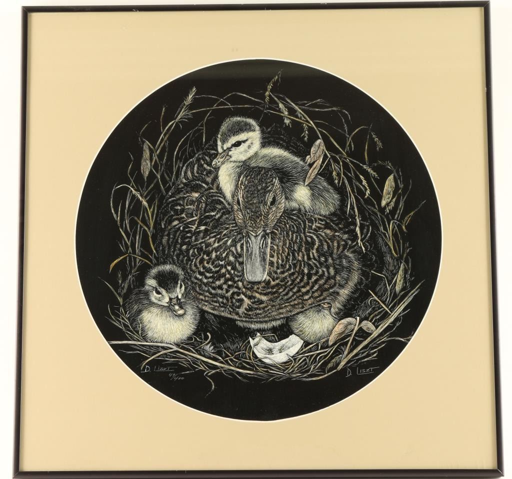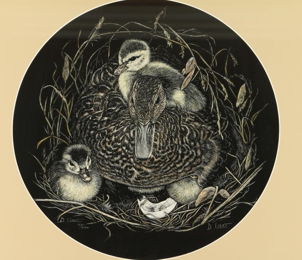 by D. Liszit of mama duck and ducklings. Image size 13" round. Single mat with black metal frame. 49/400