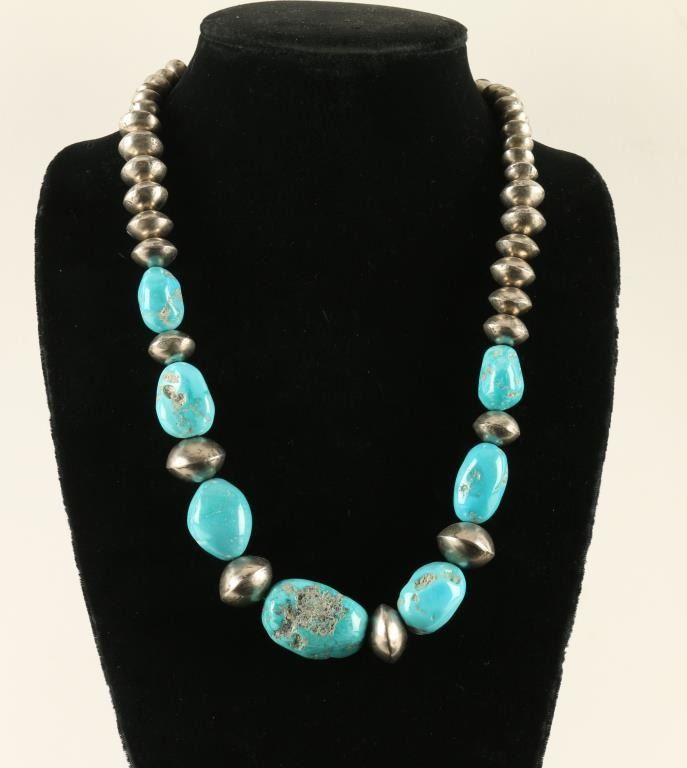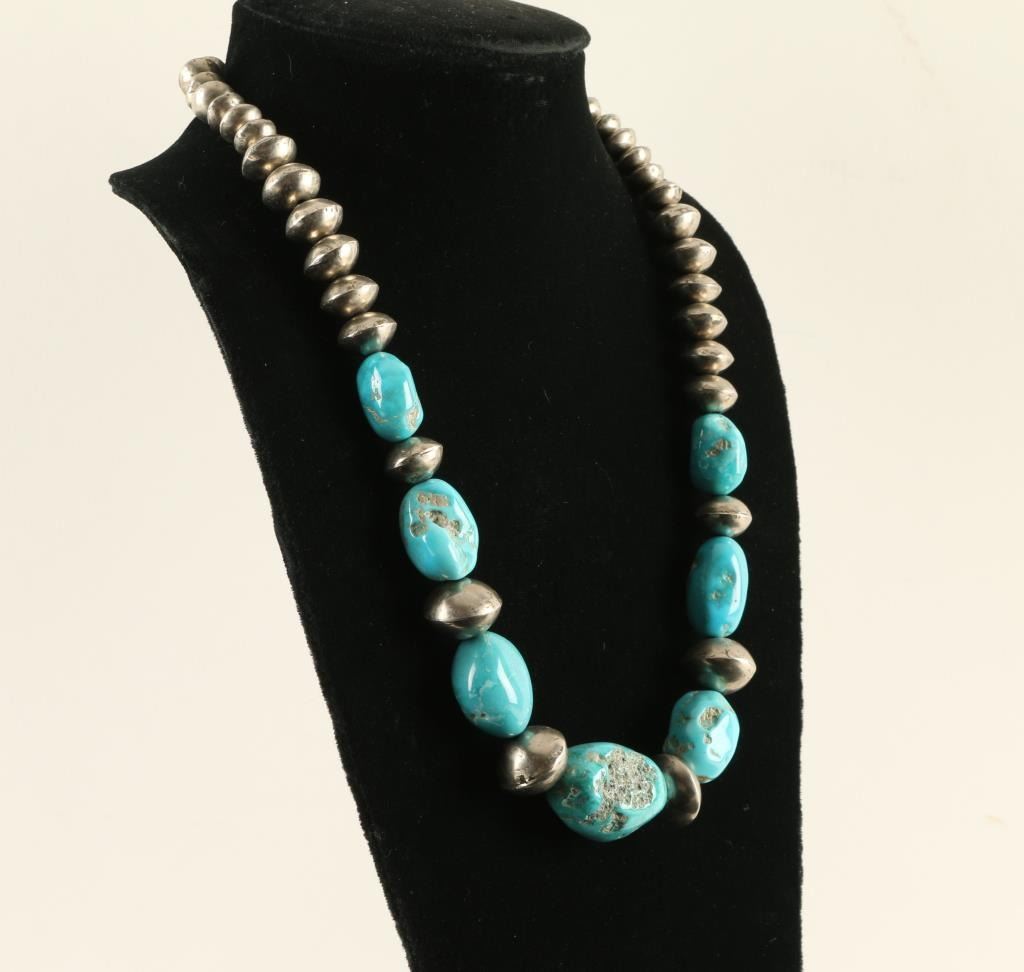 Large sleeping beauty nugget turquoise intermixed with handmade sterling silver beads, 20" long. Retail $900.