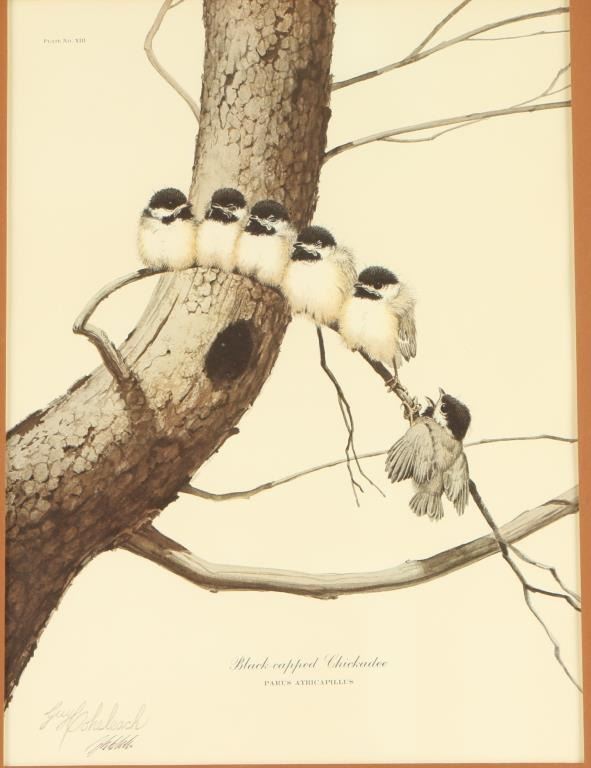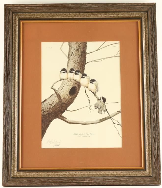 by Guy Cohelech entitled "Black Capped Chickadee". Plate No. XIII, hand signed in pencil. Image measures 15"x11" single mat in wood frame with metallic inset.