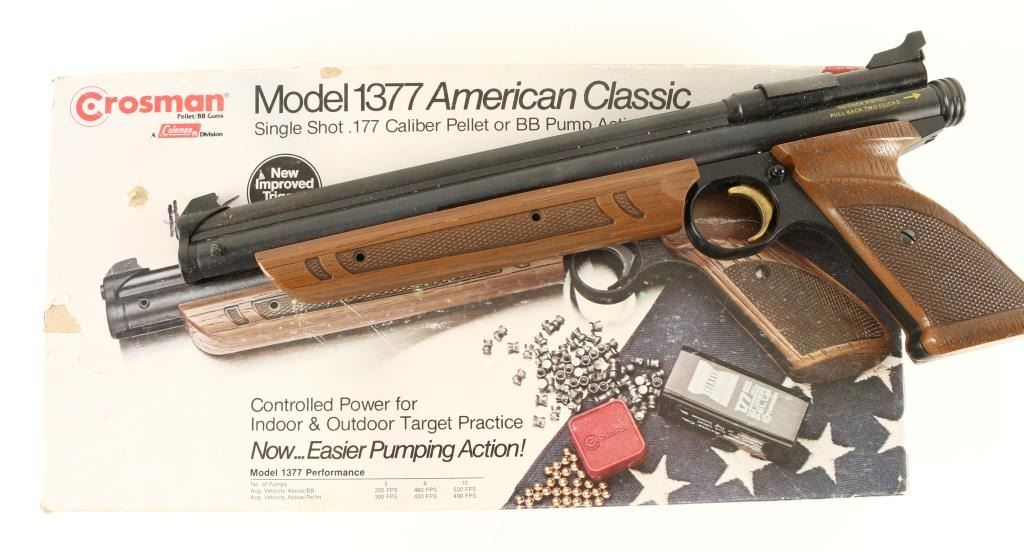 Model 1377 American Classic single shot .177 caliber pellet or BB pump action pistol. Good condition in original box.