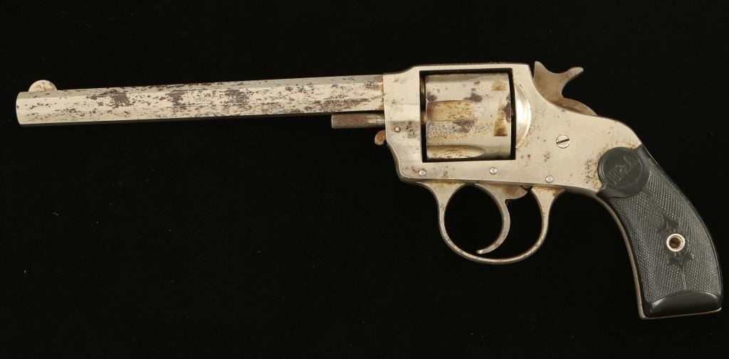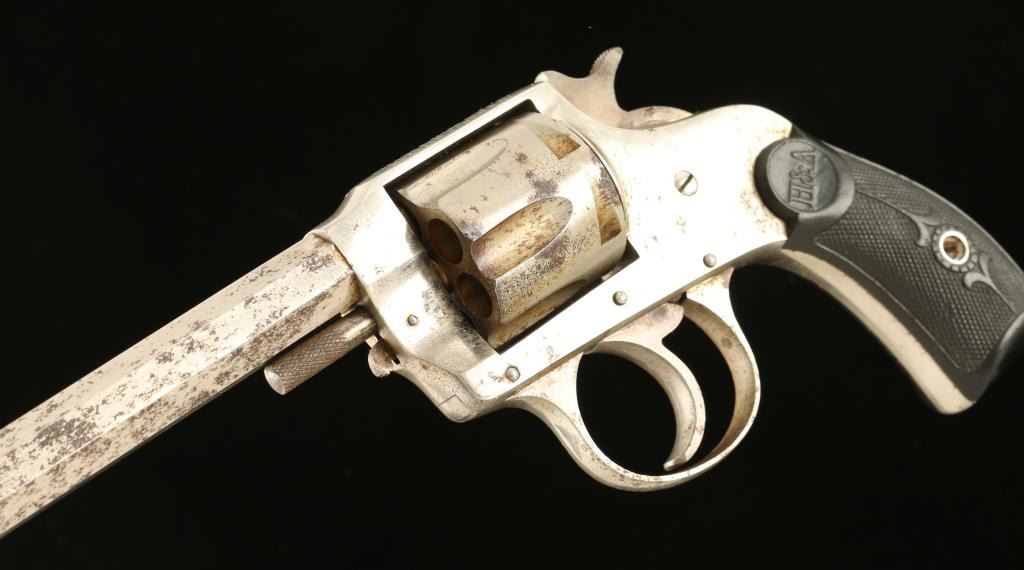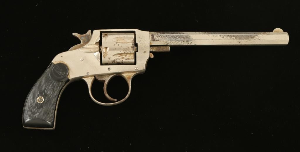 Early nickel plated double action revolver chambered in .32 Smith & Wesson Long, circa 1896-1915. Features a 6" octagonal barrel, blade front sight, notched rear sight, smooth wide trigger, case hardened hammer with checkered spur, fluted six shot cylinder, and two piece checkered black hard rubber grips. Revolver retains approximately 60% of it's nickeled finish with flaking and dark rust in the areas with no finish remaining. Action is mechanically sound, bore is excellent and grips are fine. Condition is good as vintage. ***Modern Firearm*** ***C&R Firearm***