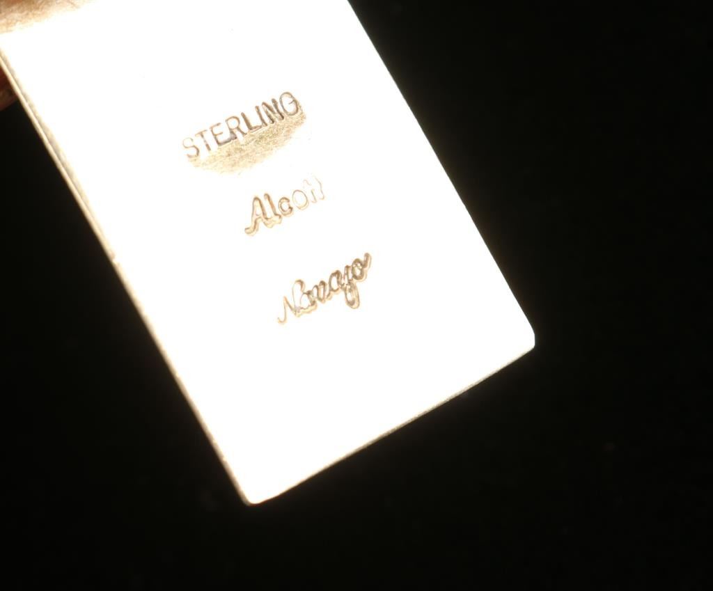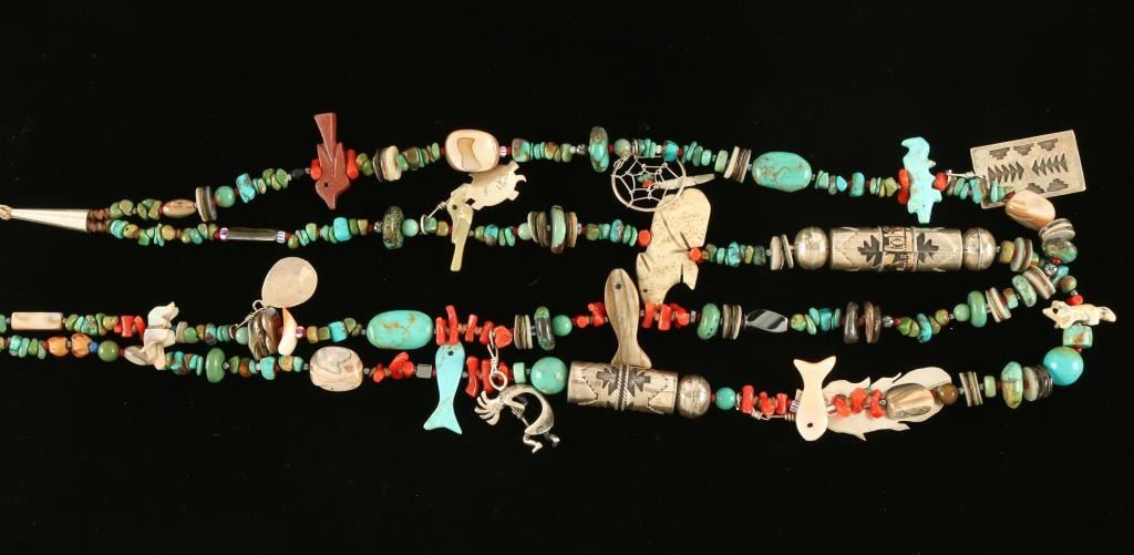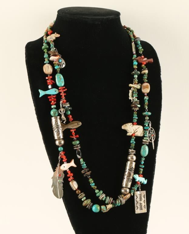 Turquoise beaded necklace with handmade sterling beads, feather charm, tree of life sterling charm marked Michael Alcott Sr, Sterling dream catcher, Sterling Kokopelli, Sterling bear claw charm, and many stone animal effigies.