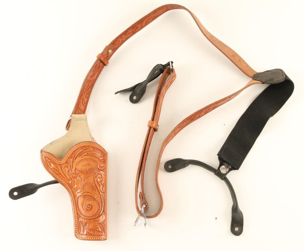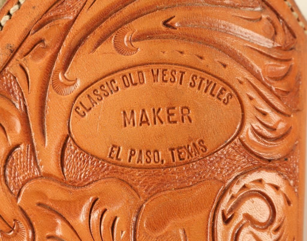 Made in El Paso, TX. Single rig brown leather floral tooled with suspender attachment.