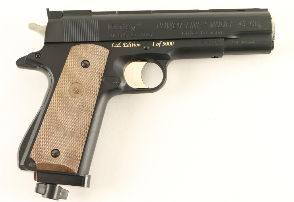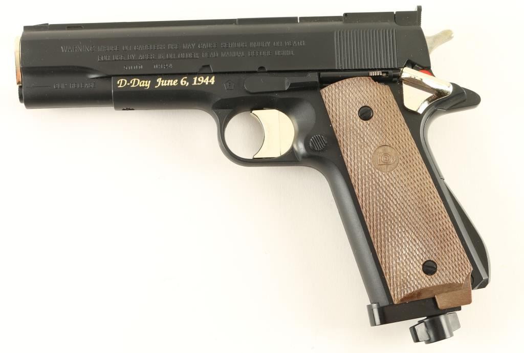 1911-A1 Stylized C02 operated semi-automatic air pistol chambered for .177 cal pellets. One of only 5,000 produced. Includes original factory box, 3 extra magazines, documents, D-Day brass buckle and a full C02 cartridge. Pistol bares many gold embellishments and remains in excellent condition.