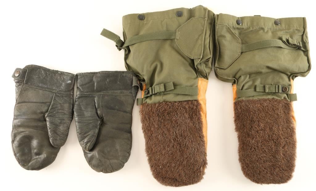 Two pairs of mittens including (1) Pair of black leather mittens with wool lining and (1) Pair of U.S.A.A.F extreme cold weather mittens.