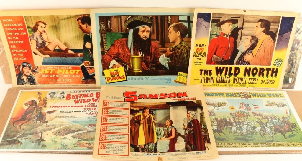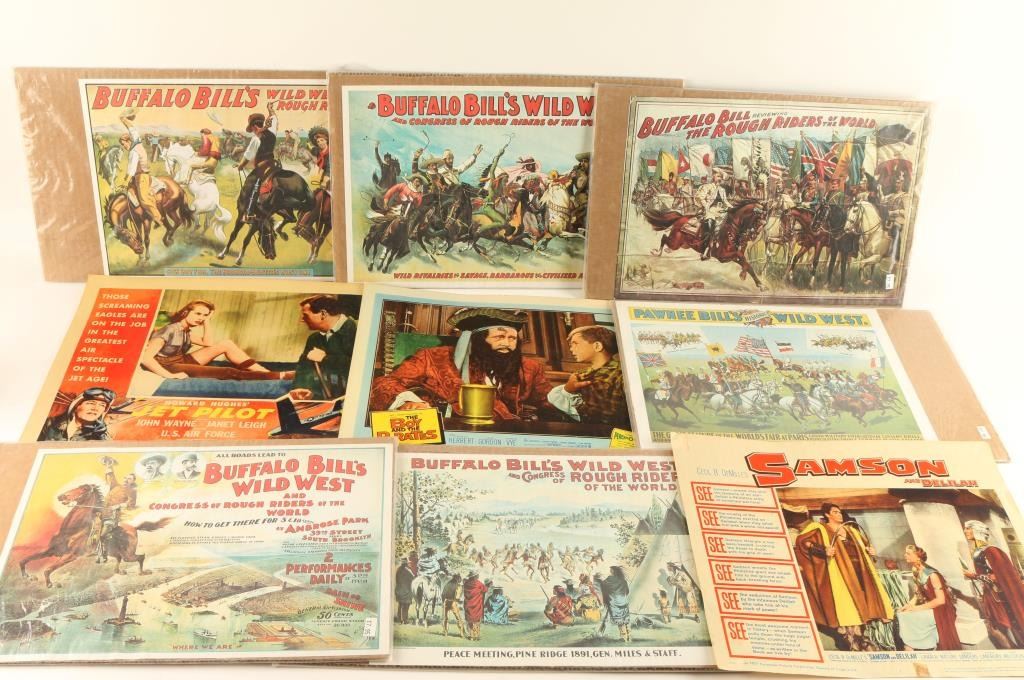 Prints of advertisers for Buffalo Bill's Wild West Shows and four old movie advertisers for "Samson and Delilah", "The Wild North", "Howard Hughes' Jet Pilot", and "The Boy and the Pirates". Great vintage collection.
