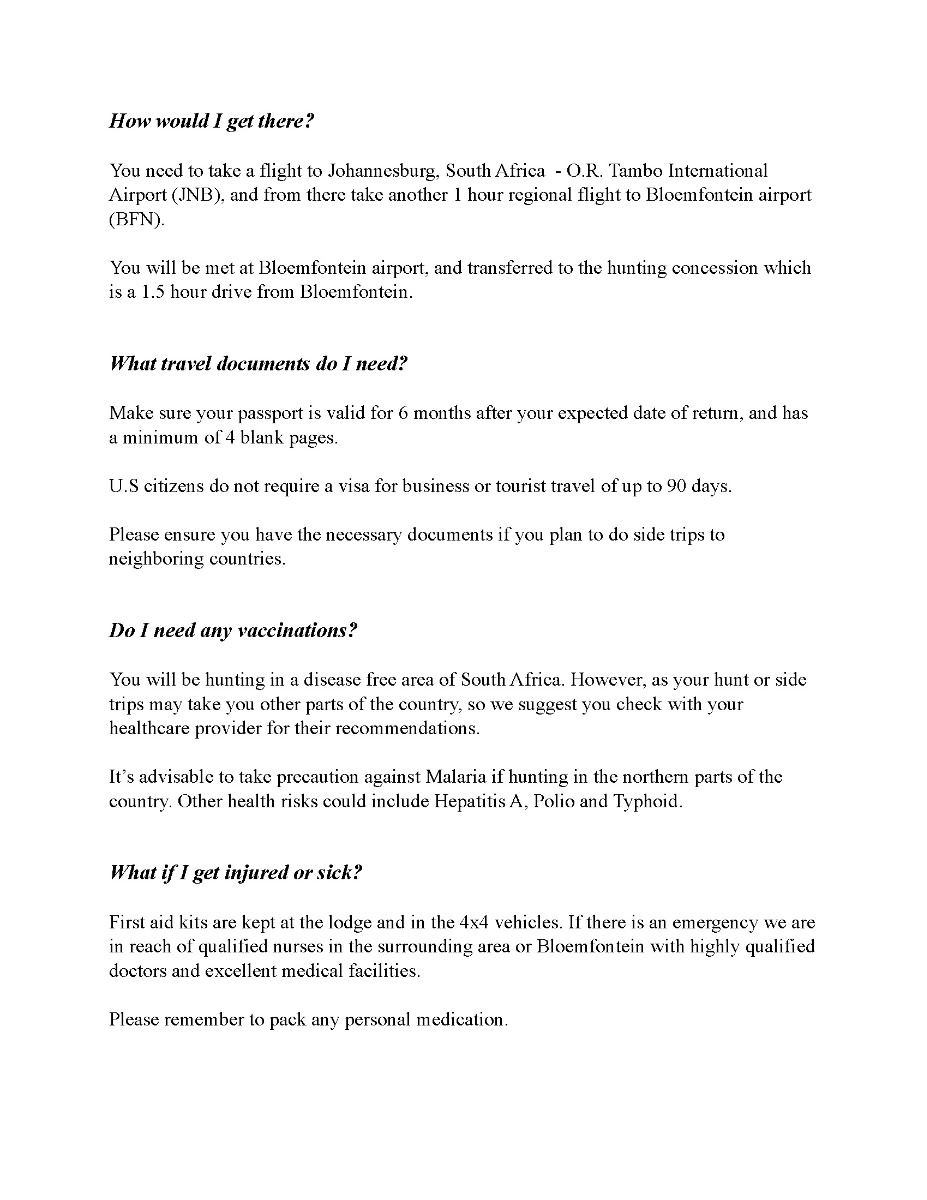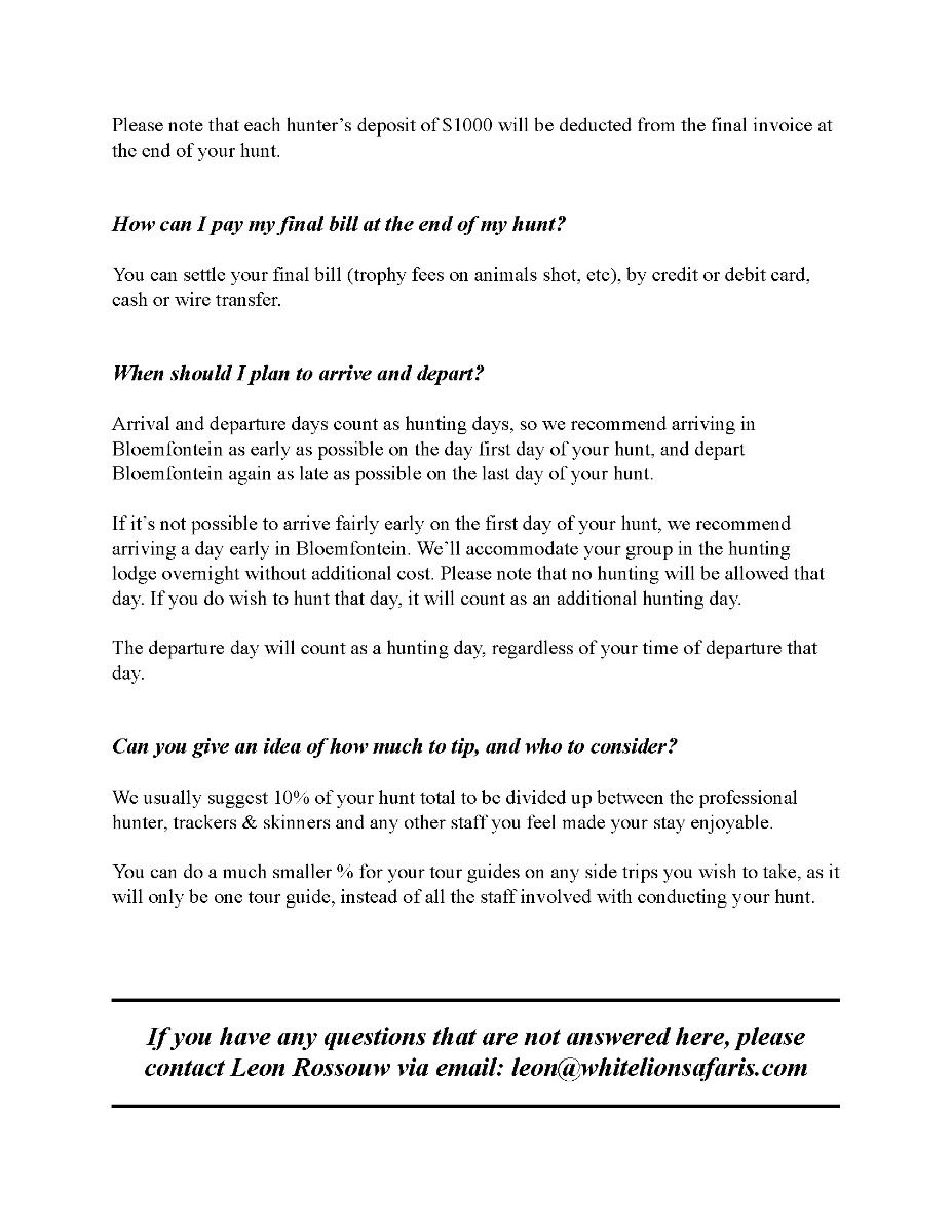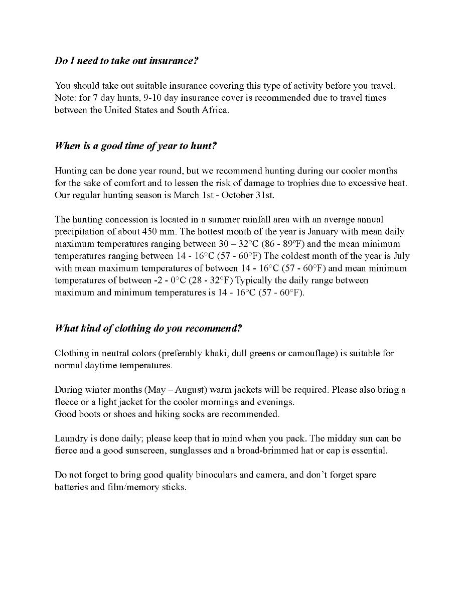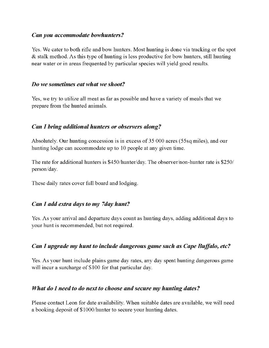 ? All accommodations during the 7 days in a luxury lodge, professional hunter, hunting vehicles as well as back up team, skinners, trackers, field dressing of trophies and delivery to our taxidermist. Exclusions: