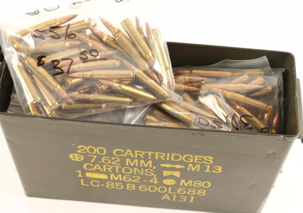 M19A1 ammo can with nine 50 round bags of .223 Remington ammunition some with green tips.