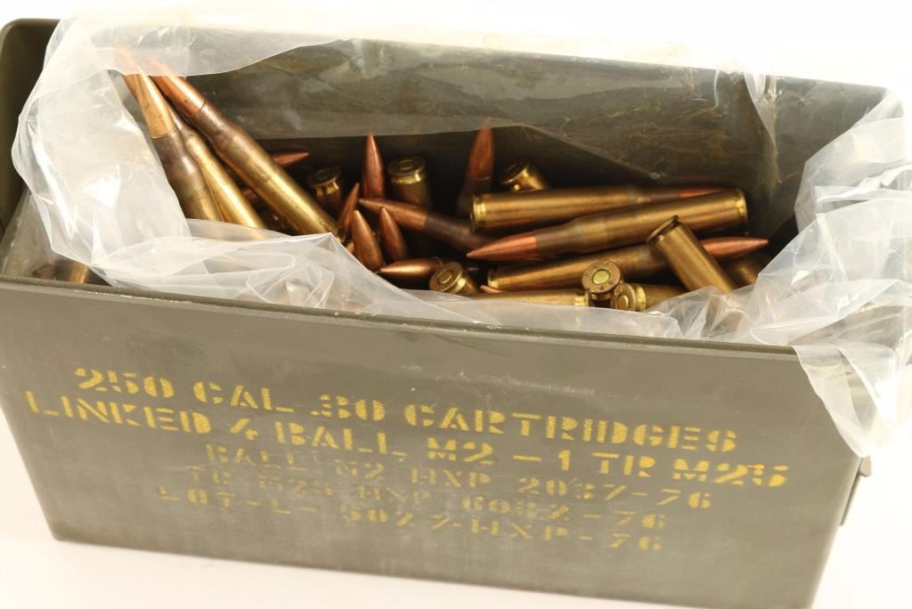 M19A1 ammo canister 3/4 full of loose .30-06 FMJ ammunition. Likely remanufactured with headstamps such as HXP 76 & HXP 64