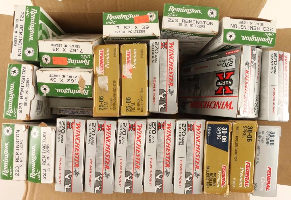 Including; 3 boxes of 7.62x39-20 Rds each, 6 boxes of 223 Rem-20 Rds each, 2 boxes of 25-06 Rem-20 Rds each, 8 boxes of 270 Win-2 Rds each, 3 boxes 30-06 Sprg-20 Rds each, and 9mm Luger shotshells 20 Rds and 10 Rds 38/357 shotshells.
