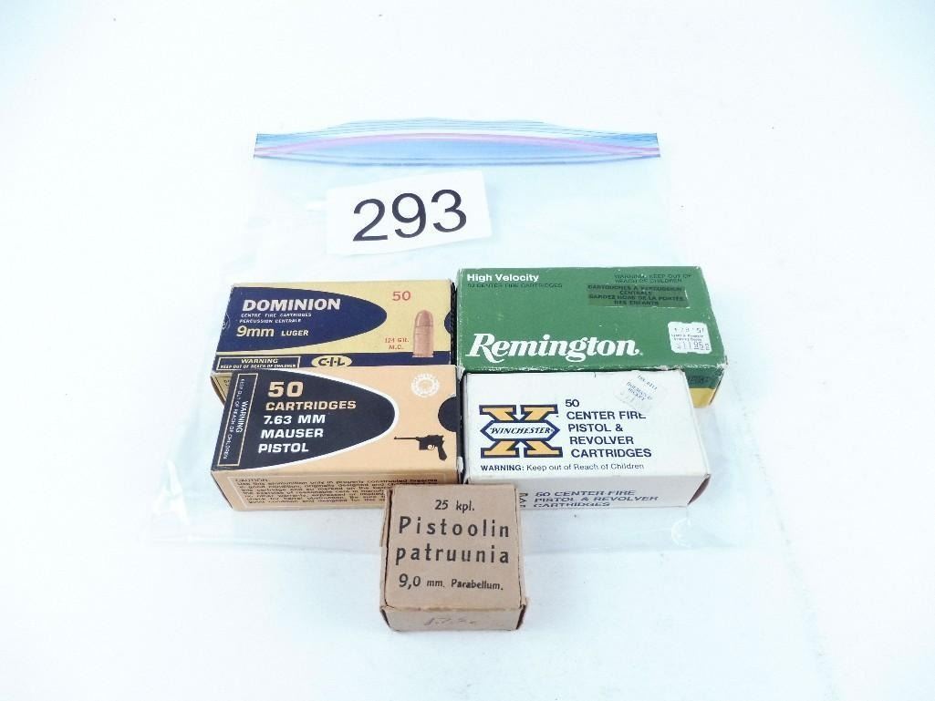 Lot 293 50 rounds 7.63mm Mauser, 50 rounds 9mm Luger 115 grain, 100 rounds 9mm Luger 124 grain & 25 rounds 9