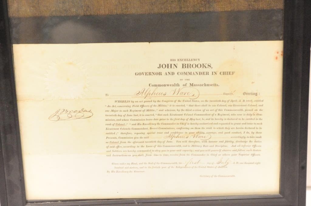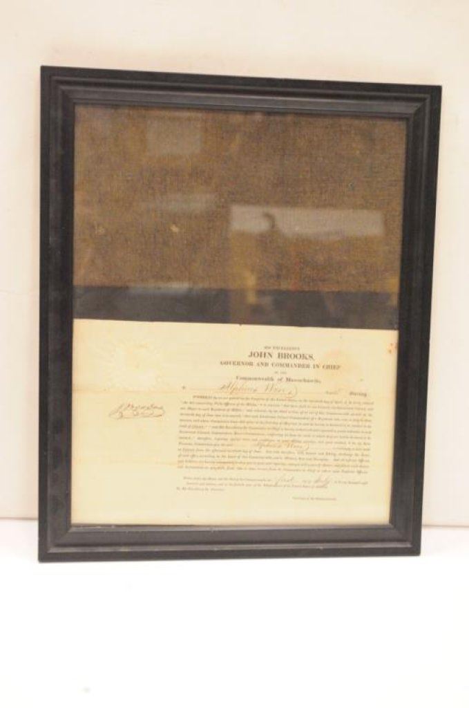 1816 and signed by John Brooks and sealed as Governor of Massachusetts; Brooks was at Lexington, Concord and Valley Forge; frame is approximately 23” x 18.5” overall. Est.: $150-$300.