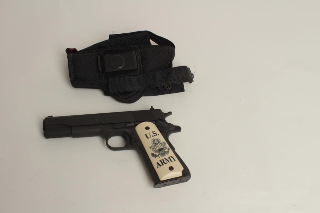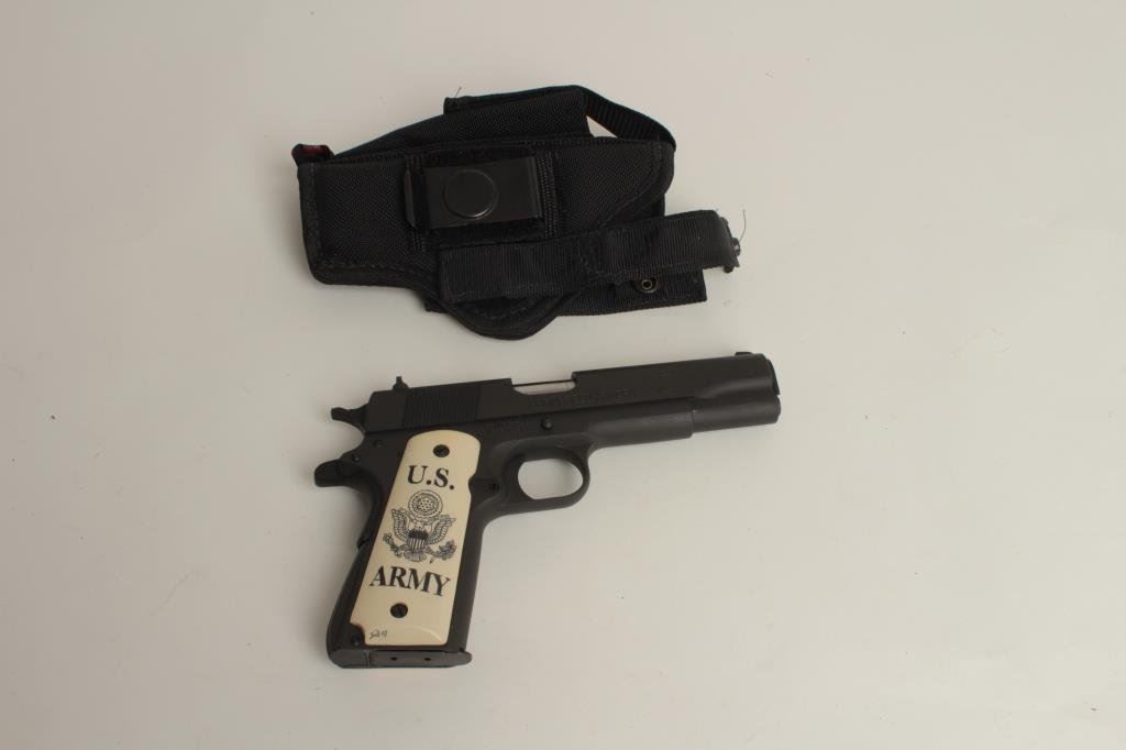 caliber, 5” barrel, mat black finish, simulated ivory grips with “U.S. Army” and spread eagle decoration, S/N N452360, in overall fine condition showing the majority of its original finish, fine bore, action, markings and custom grips; accompanied by an ACE brand woven fabric holster. (Modern/PPT). Est.: $300-$600.