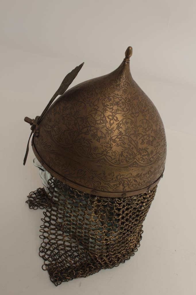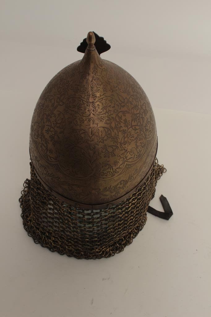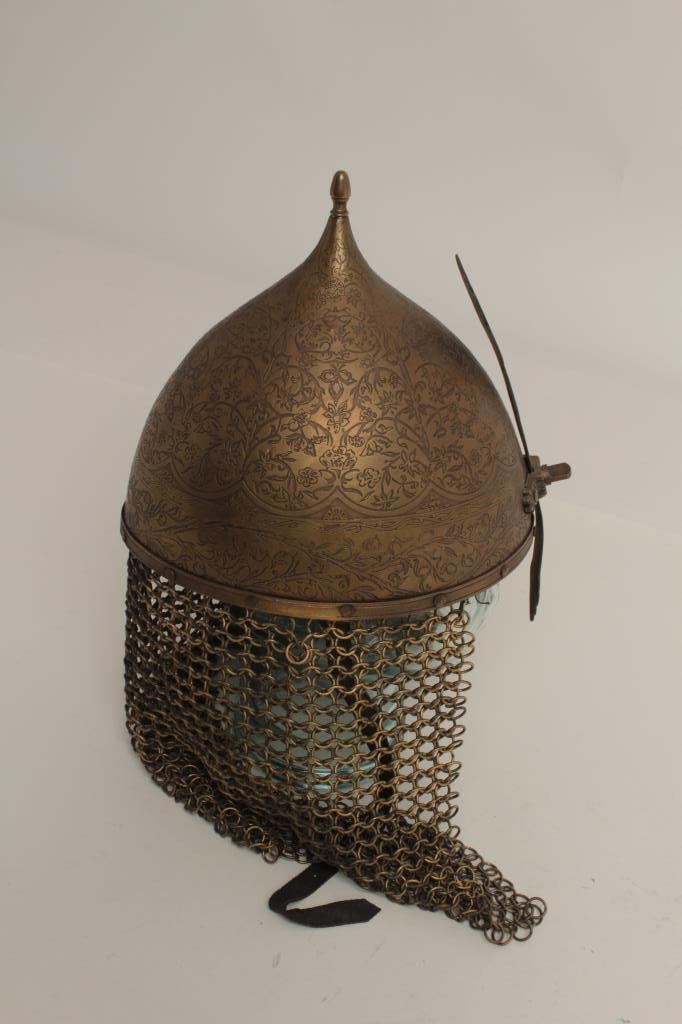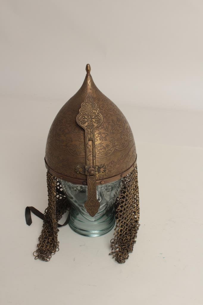 Lot 41 Engraved Persian style helmet; brass with chain drop