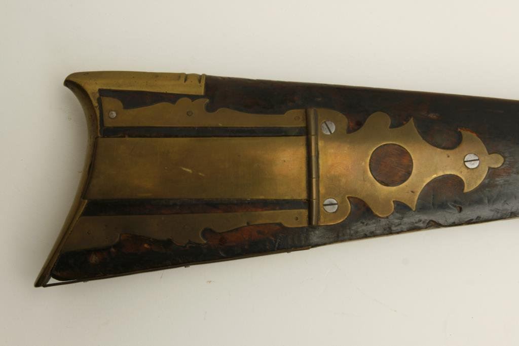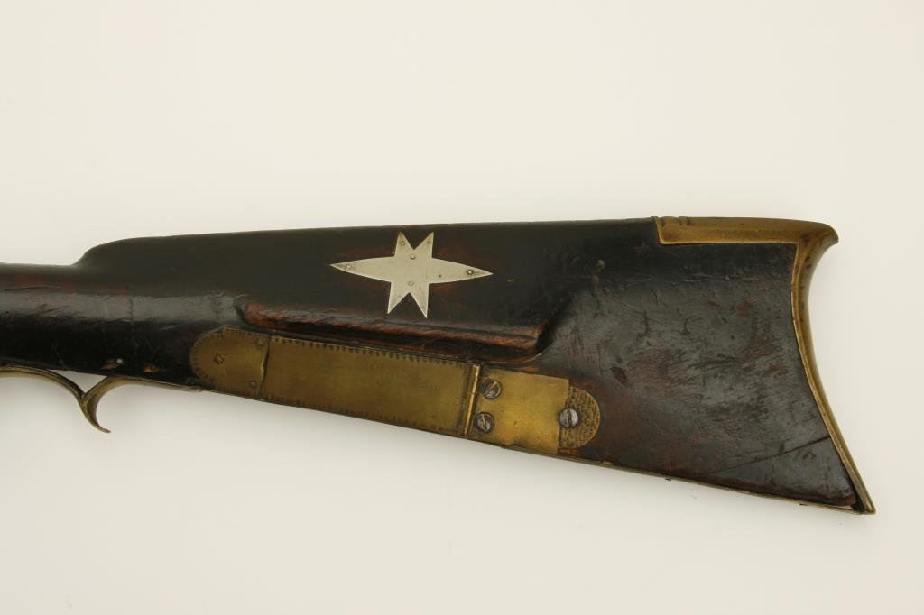 .41 caliber, 37” octagon barrel marked “No 36” on the top flat and with a brass inset marked “1843”, also on the top flat of the barrel; double set triggers, brass mounts including a brass patchbox on both sides of the butt stock; action displaying scattered surface rust and is not functioning; wood stock shows dark patina and several old repairs and a couple of age cracks. (Antique). Est.: $400-$800.