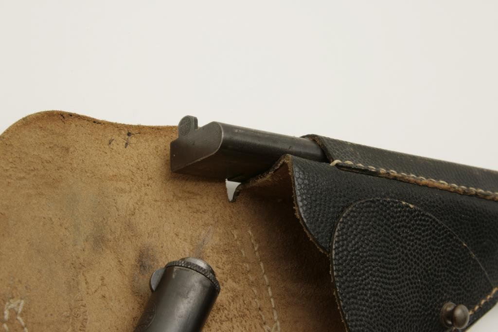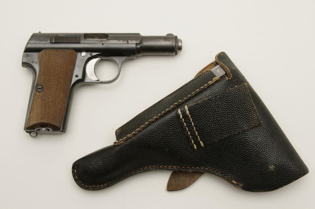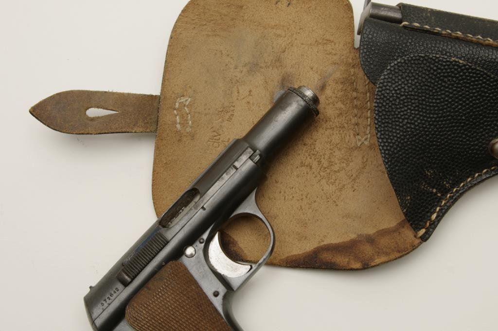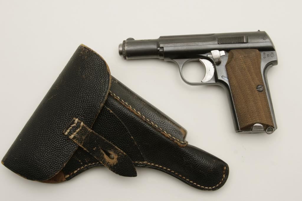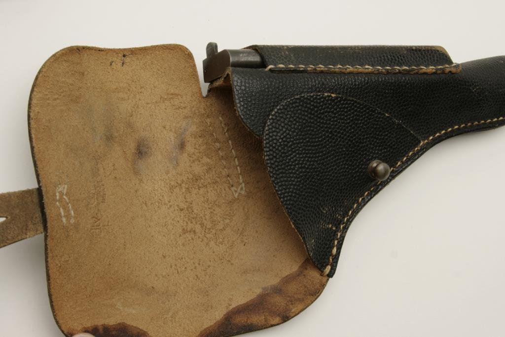 barrel, nazi proofed, S/N 572642, blued finish, checkered wood grips, in overall very good condition and accompanied by a flap leather holster with extra magazine (C&R). Est.: $600-$1,200.