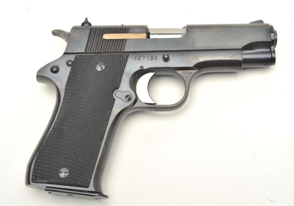 semi-automatic pistol, 9mm caliber, 4” barrel, S/N 327133, black finish, checkered black grips, one extra magazine, in overall near new condition; interior of deluxe hardwood casing has two color interior lining and descriptive custom plaques. Also accompanied by factory cardboard box and instructions. (Modern/PPT). Est.: $500-$1,000.