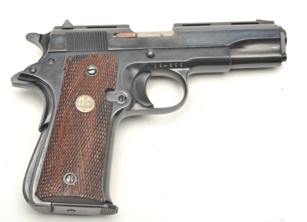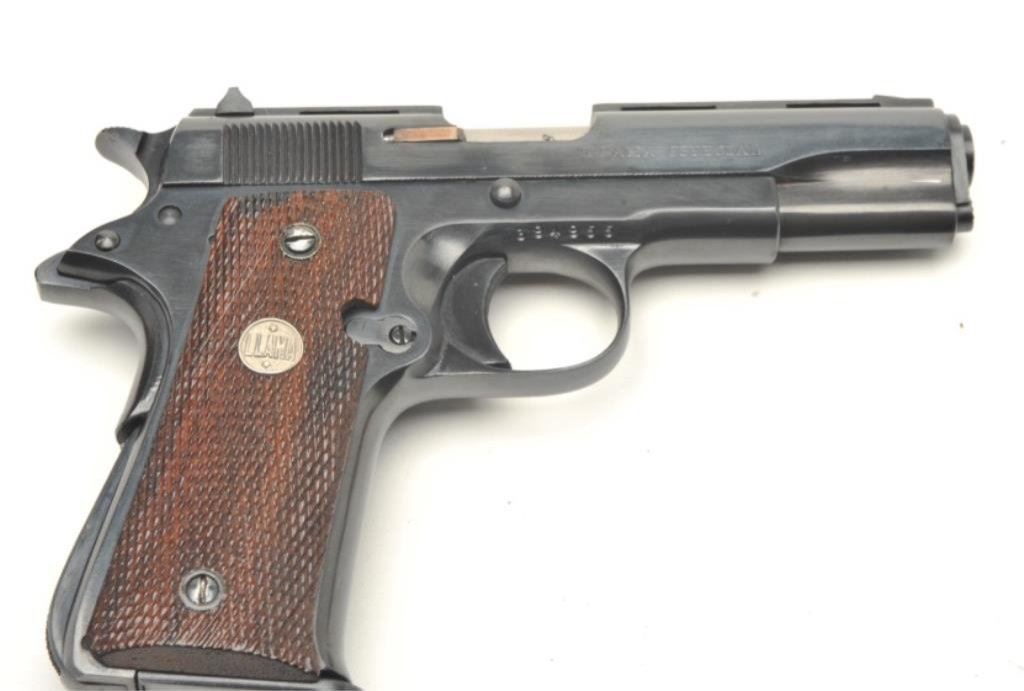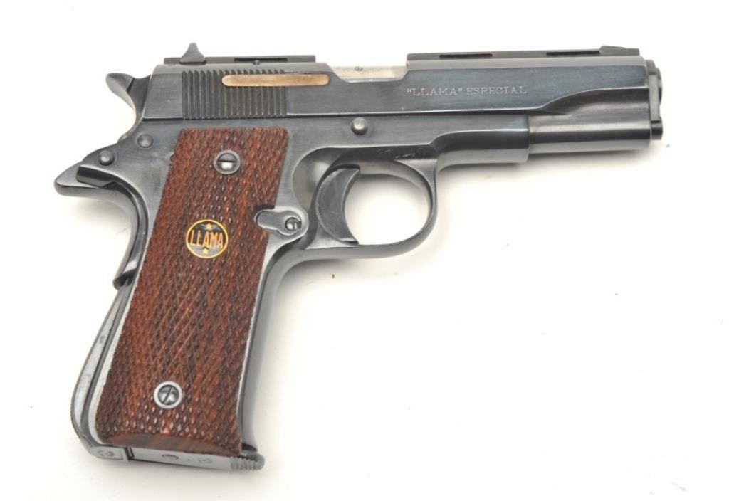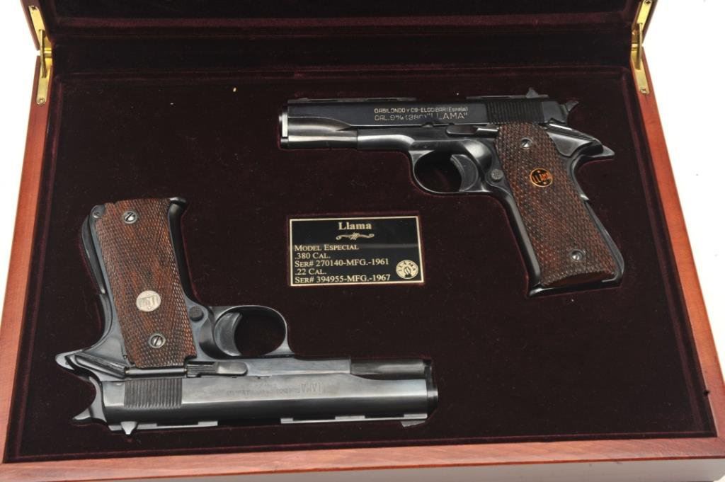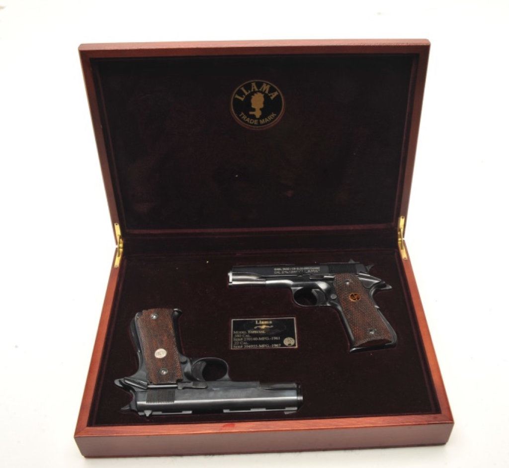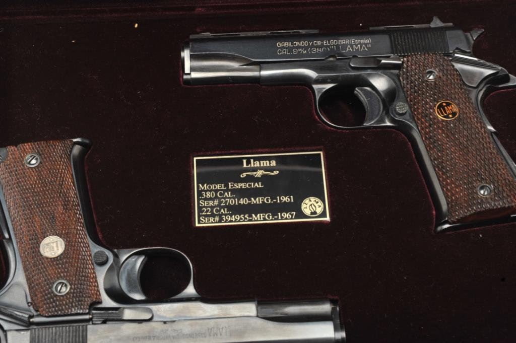 Models; one gun is .22 caliber, 3.75” barrel, blued finish, checkered wood medallion grips in overall excellent condition with original factory two piece cardboard box, S/N 394955; the other is .380 caliber, 3.75” barrel, blued finish, checkered wood grips with medallion, S/N 270140; both are in excellent condition. (Modern/PPT). Est.: $700-$1,400.