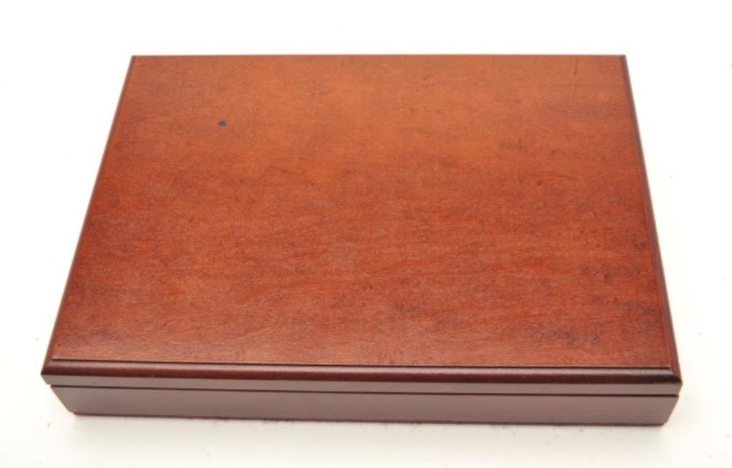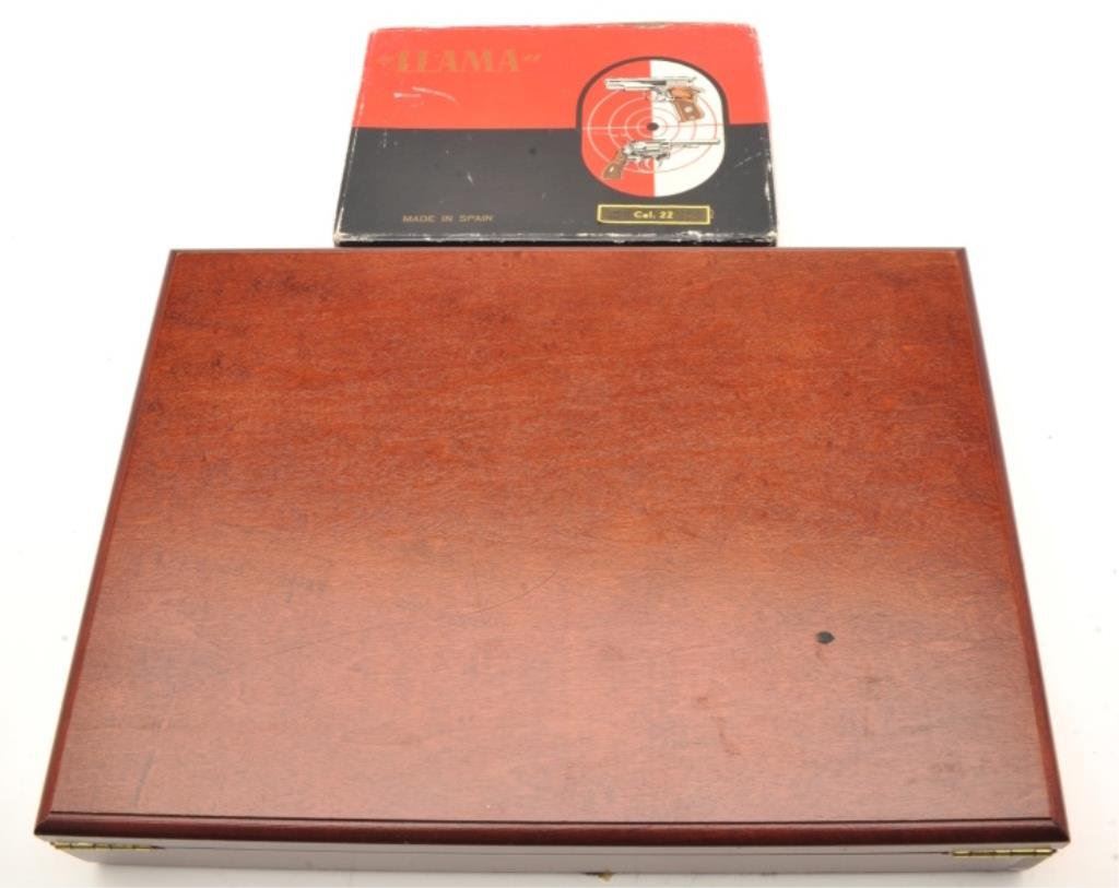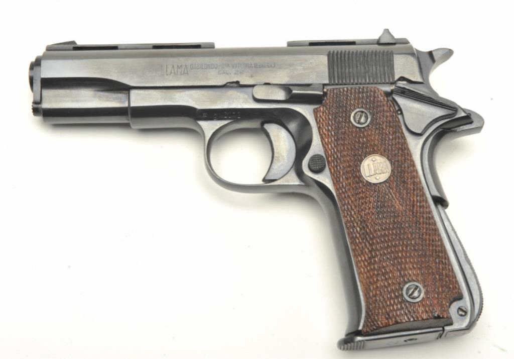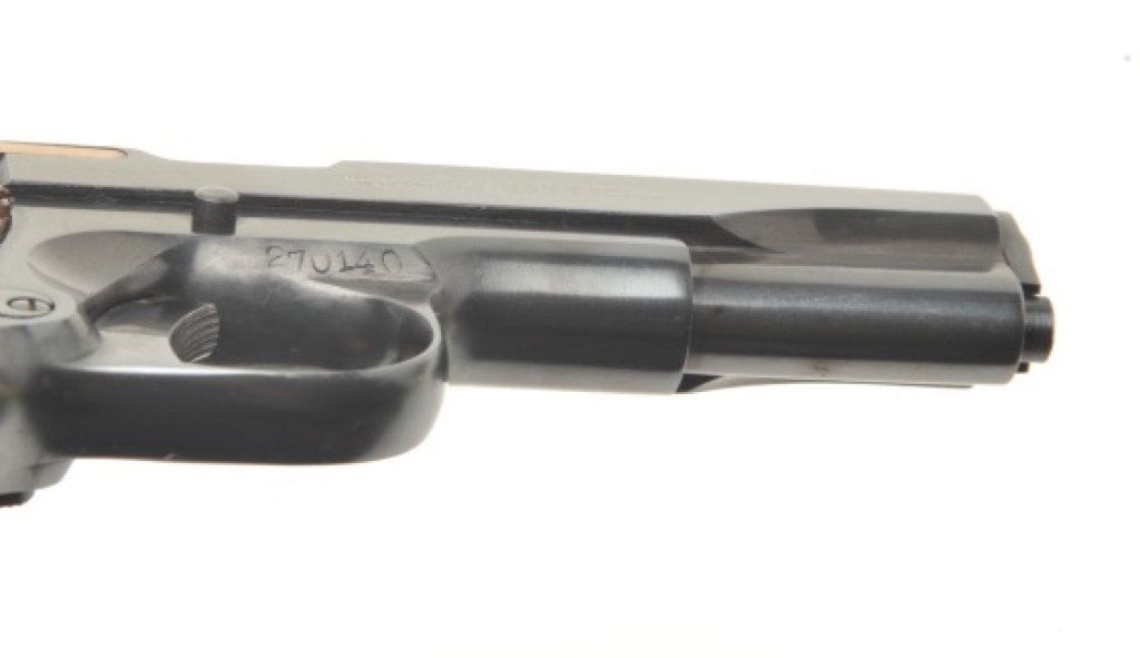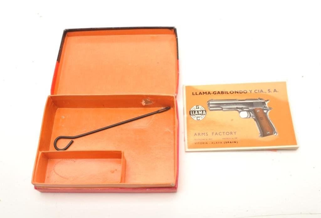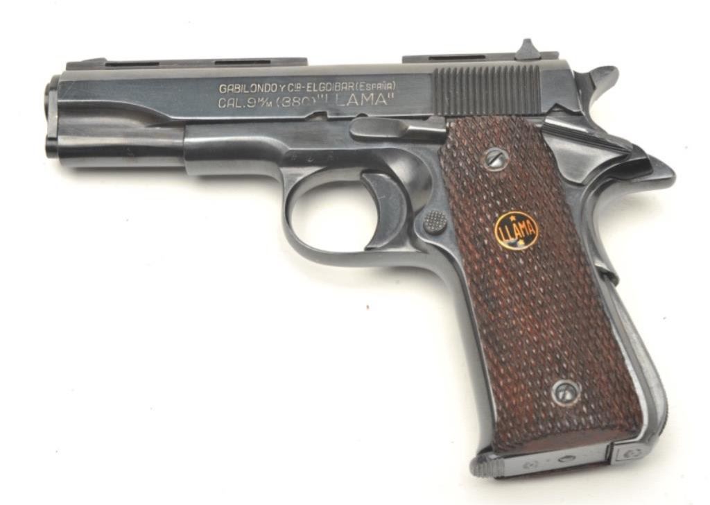 Models; one gun is .22 caliber, 3.75” barrel, blued finish, checkered wood medallion grips in overall excellent condition with original factory two piece cardboard box, S/N 394955; the other is .380 caliber, 3.75” barrel, blued finish, checkered wood grips with medallion, S/N 270140; both are in excellent condition. (Modern/PPT). Est.: $700-$1,400.