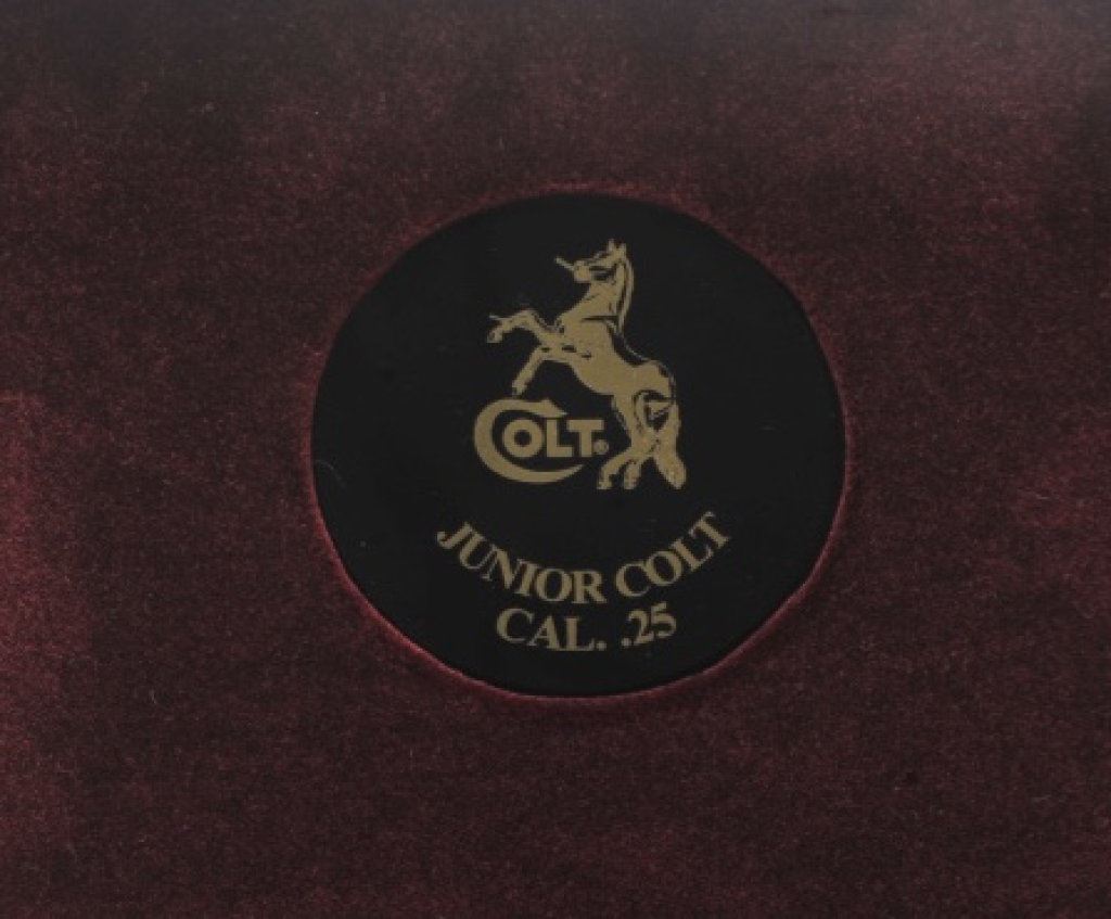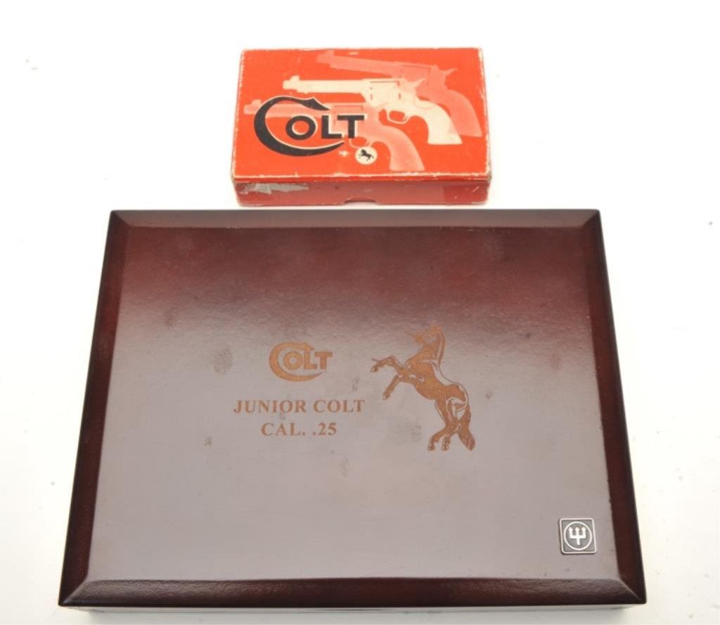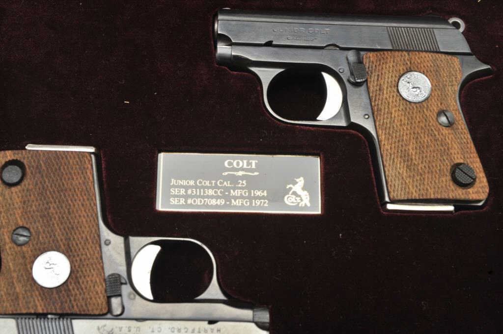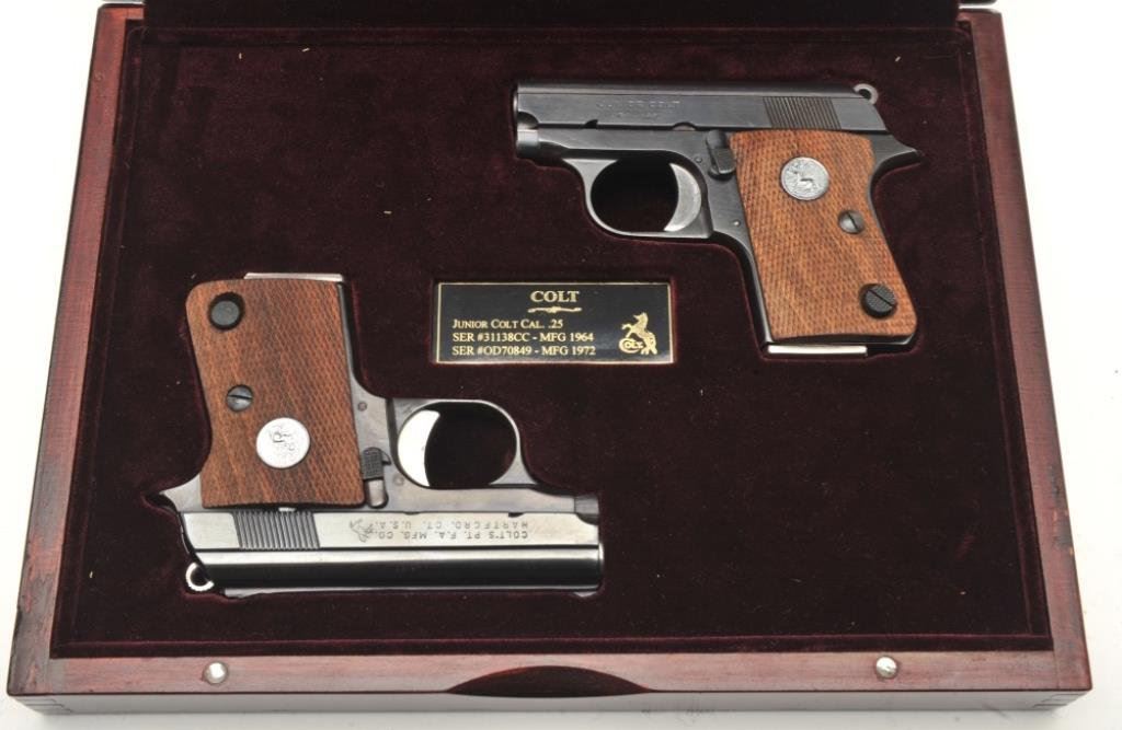 Junior Model semi-automatic pistols, 2” barrels, S/Ns 31138CC and OD70849, both with checkered wood medallion grips, blued finish and nickeled magazines. Both guns are in near new condition. The box is beautifully lined in maroon fabric with custom insets and laser markings on the lid including the Colt insignia and rampant Colt horse. Also accompanying this lot is the factory two piece cardboard box for S/N OD7849 with instructions. (Modern/PPT). Est.: $800-$1,600.