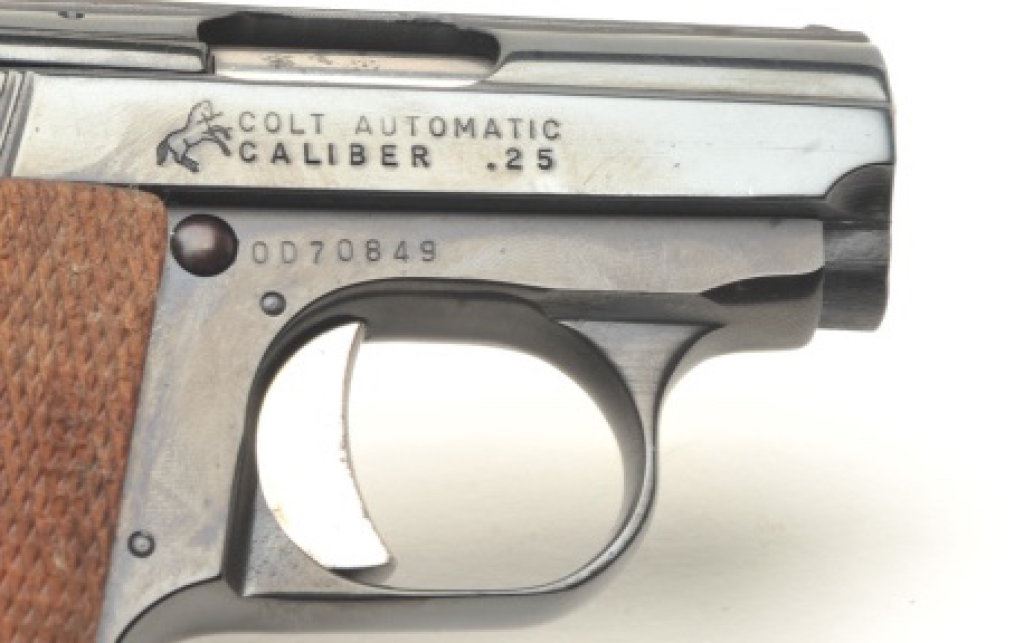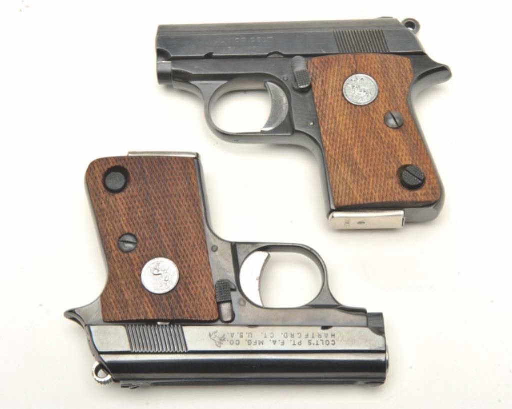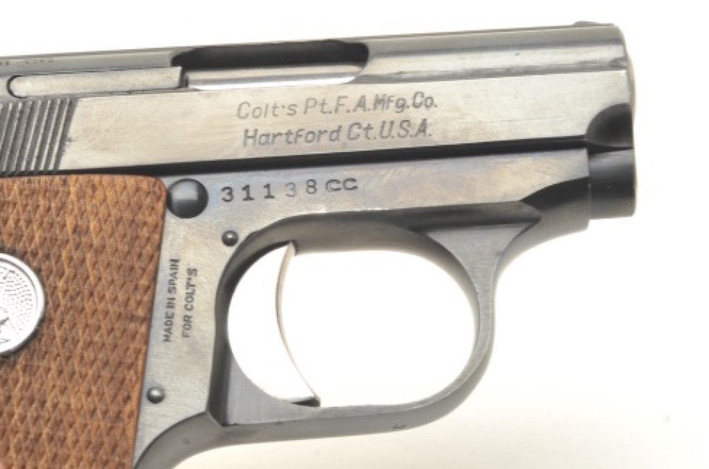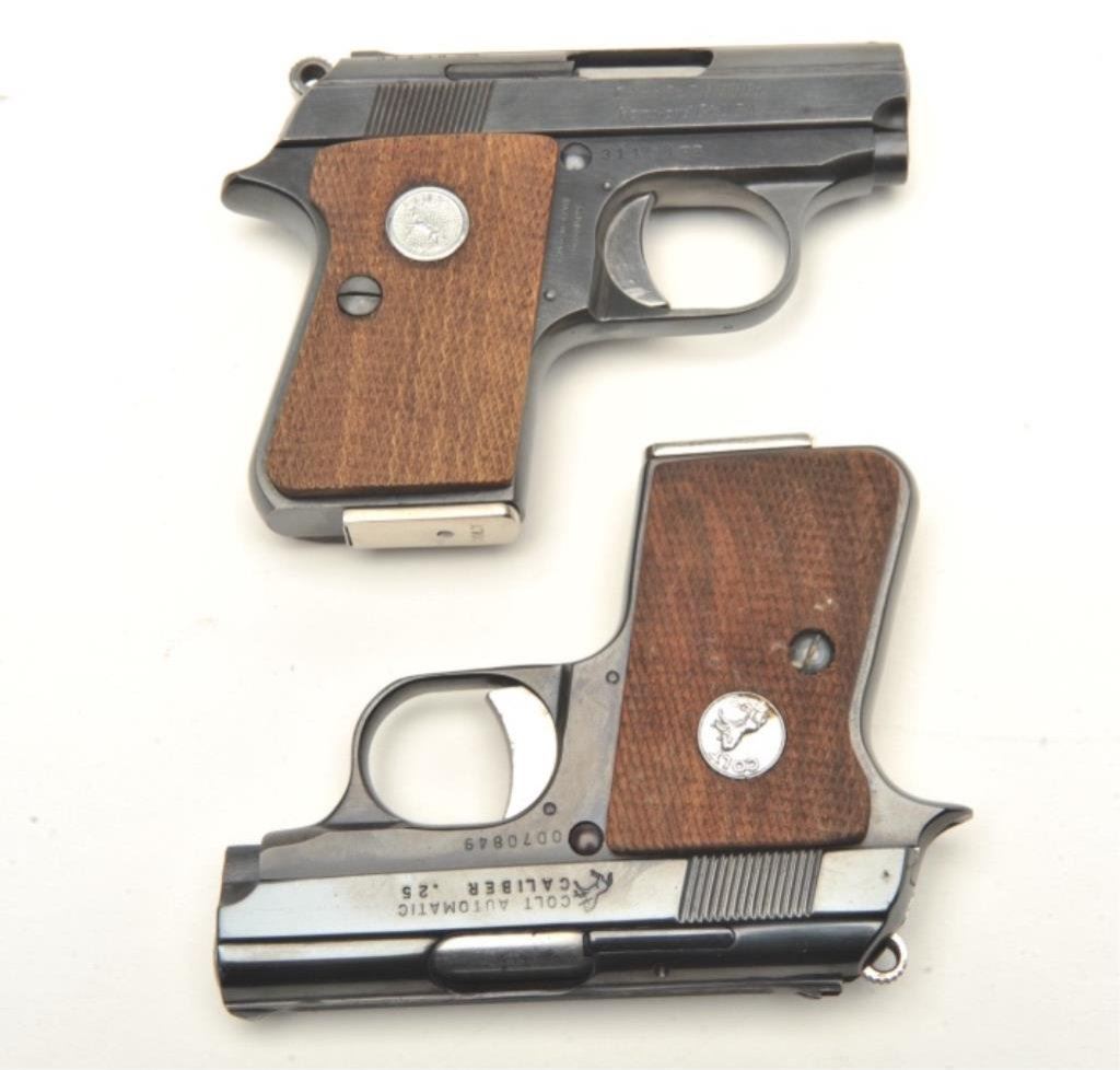 Junior Model semi-automatic pistols, 2” barrels, S/Ns 31138CC and OD70849, both with checkered wood medallion grips, blued finish and nickeled magazines. Both guns are in near new condition. The box is beautifully lined in maroon fabric with custom insets and laser markings on the lid including the Colt insignia and rampant Colt horse. Also accompanying this lot is the factory two piece cardboard box for S/N OD7849 with instructions. (Modern/PPT). Est.: $800-$1,600.