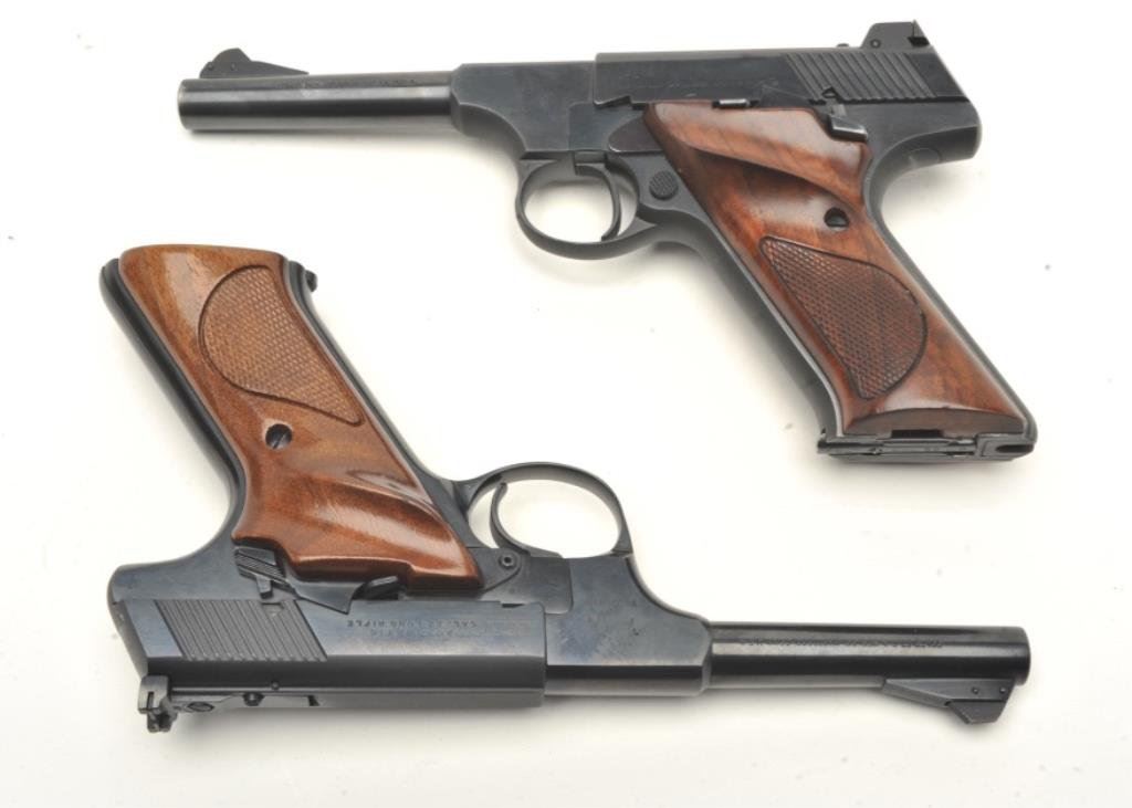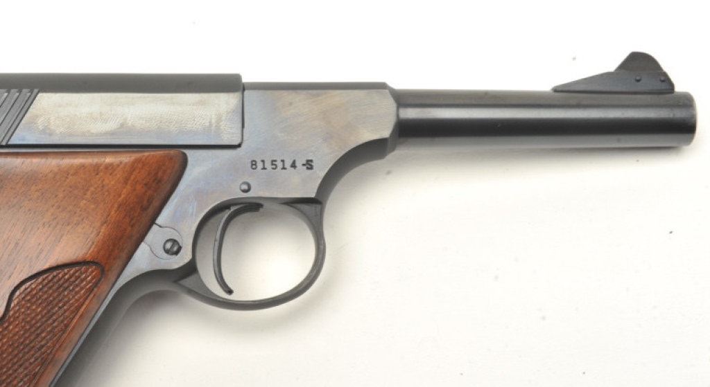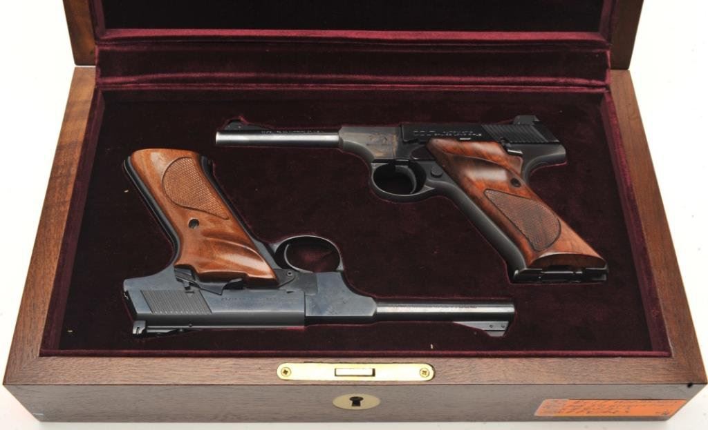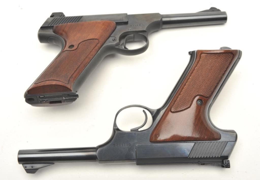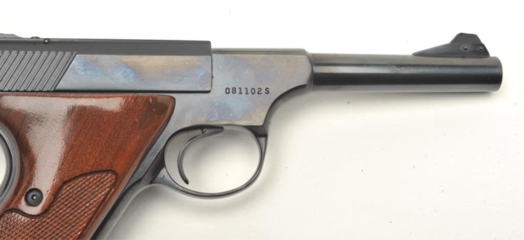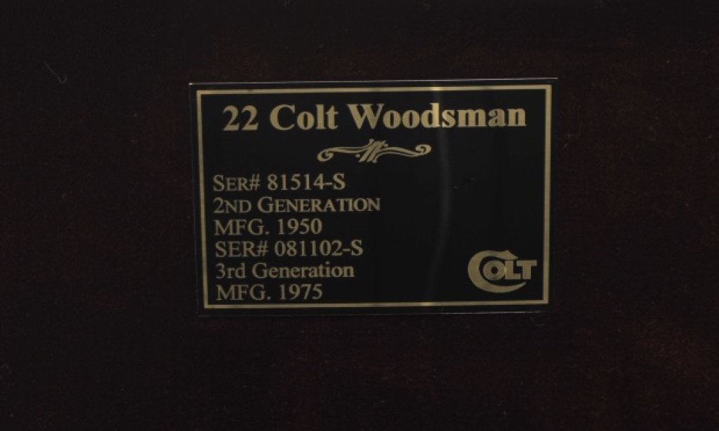 Colt Woodsman semi-automatic pistols, .22LR caliber, 4.5” barrels, blued finish, checkered wood target grips, S/Ns 81514-S & 081102-S, both in excellent condition with #81514-S displaying minor muzzle wear. (Modern/PPT). Est.: $1,000-$2,000.