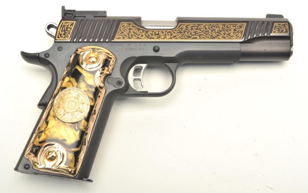 Target semi-automatic pistol, .45 caliber, 5” barrel, engraving is gold ornamented, S/N KDMG067, blued finish, custom gold grips with onyx insets; in near new condition . (Modern/PPT). Est.: $1,400-$2,800.